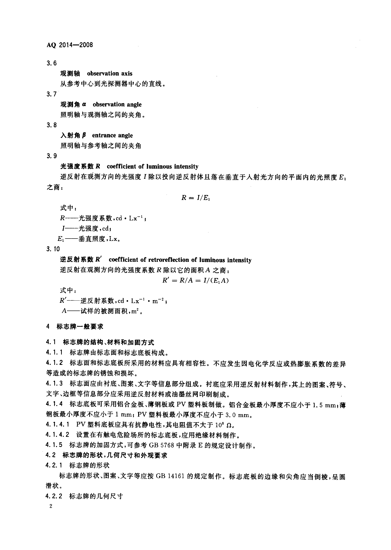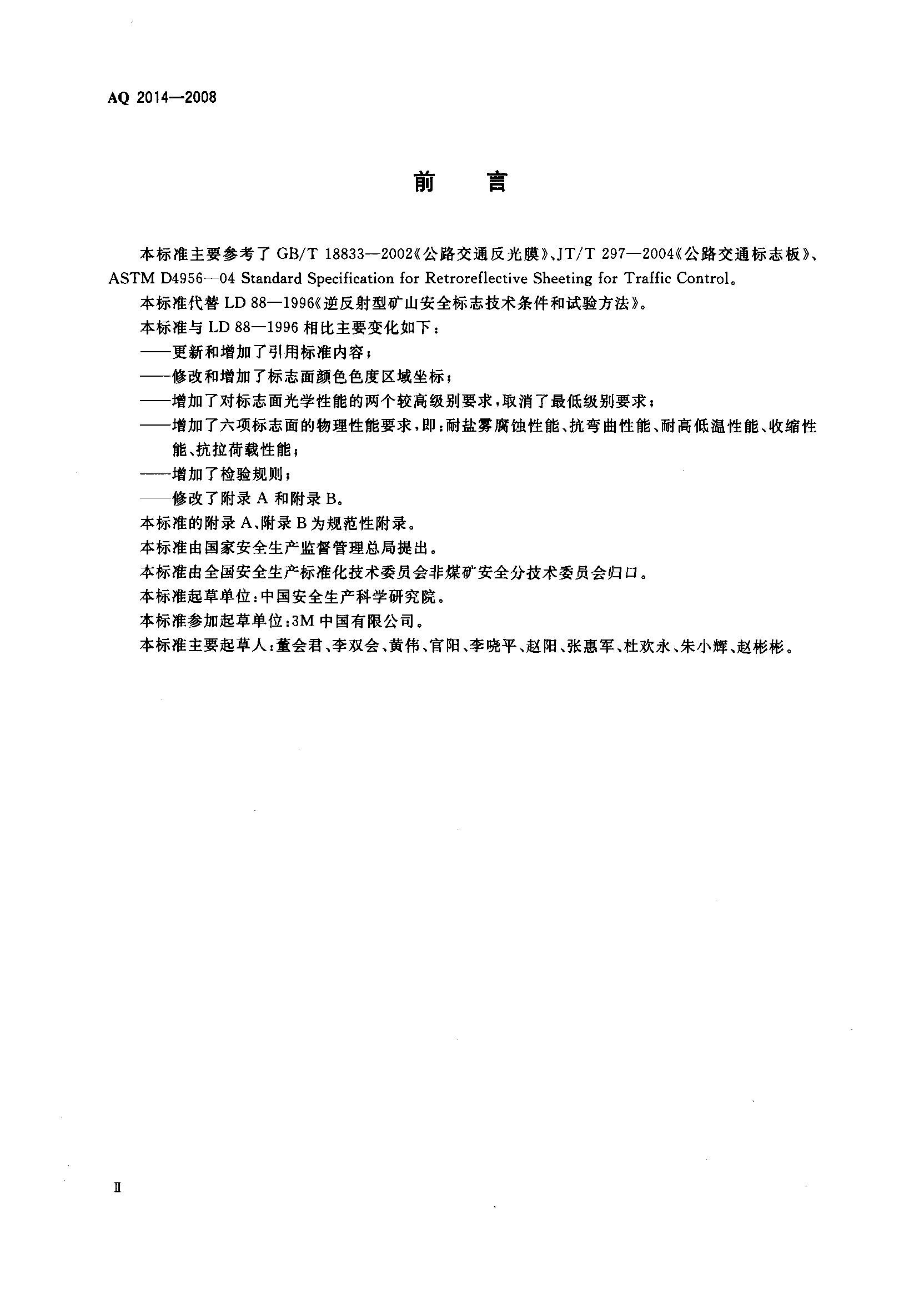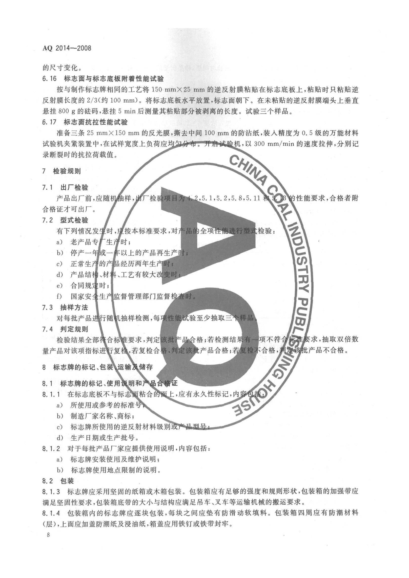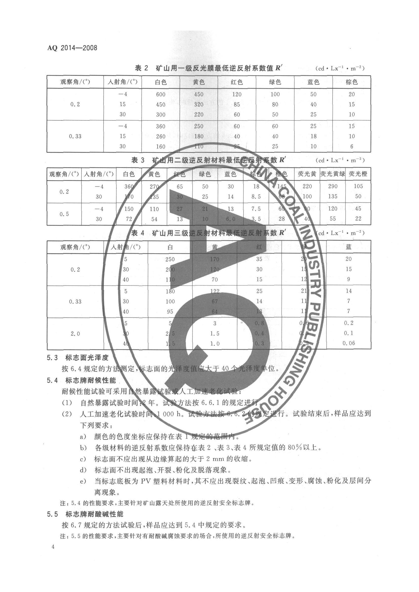 《逆反射型矿山安全标志技术条件和试验方法》(AQ2014-2008)