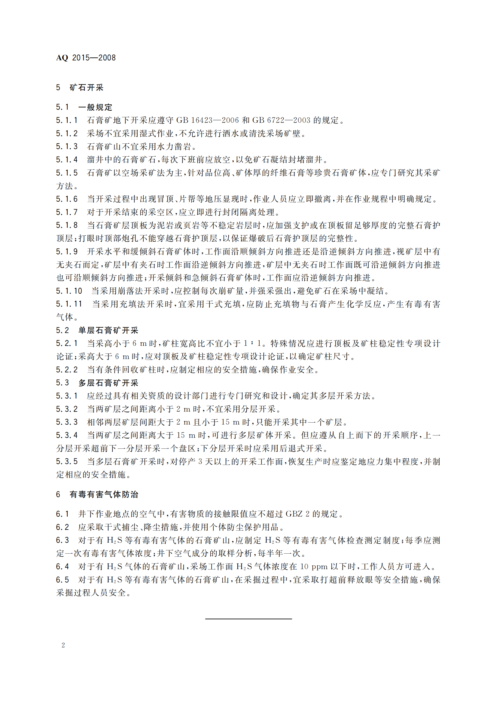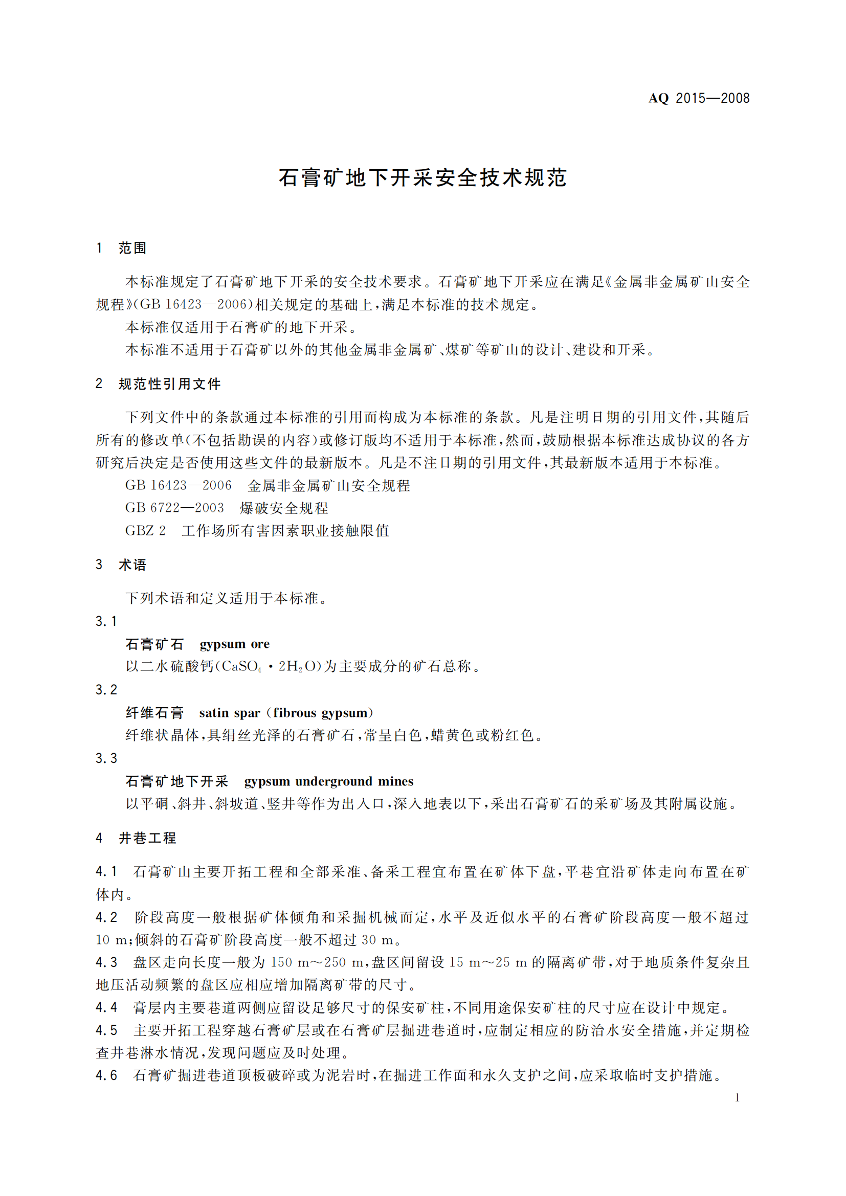 《石膏矿地下开采安全技术规范》(AQ20152008)
