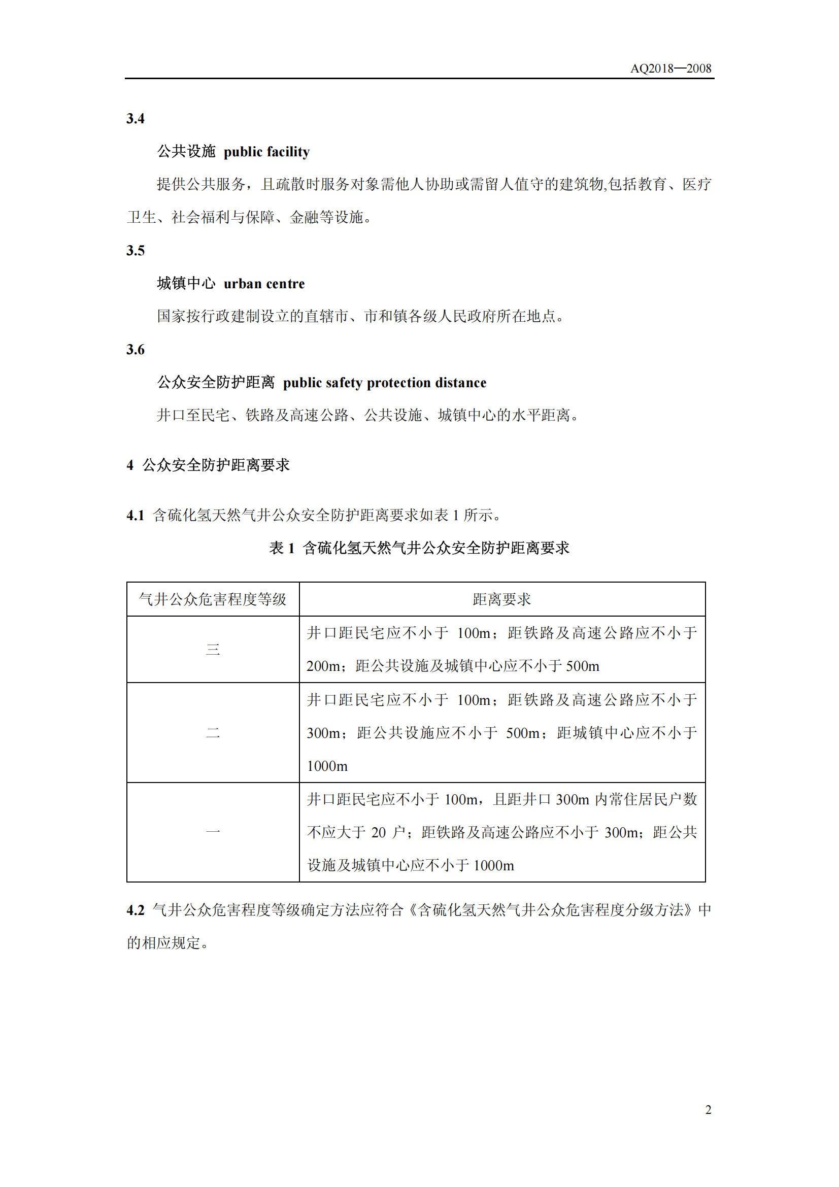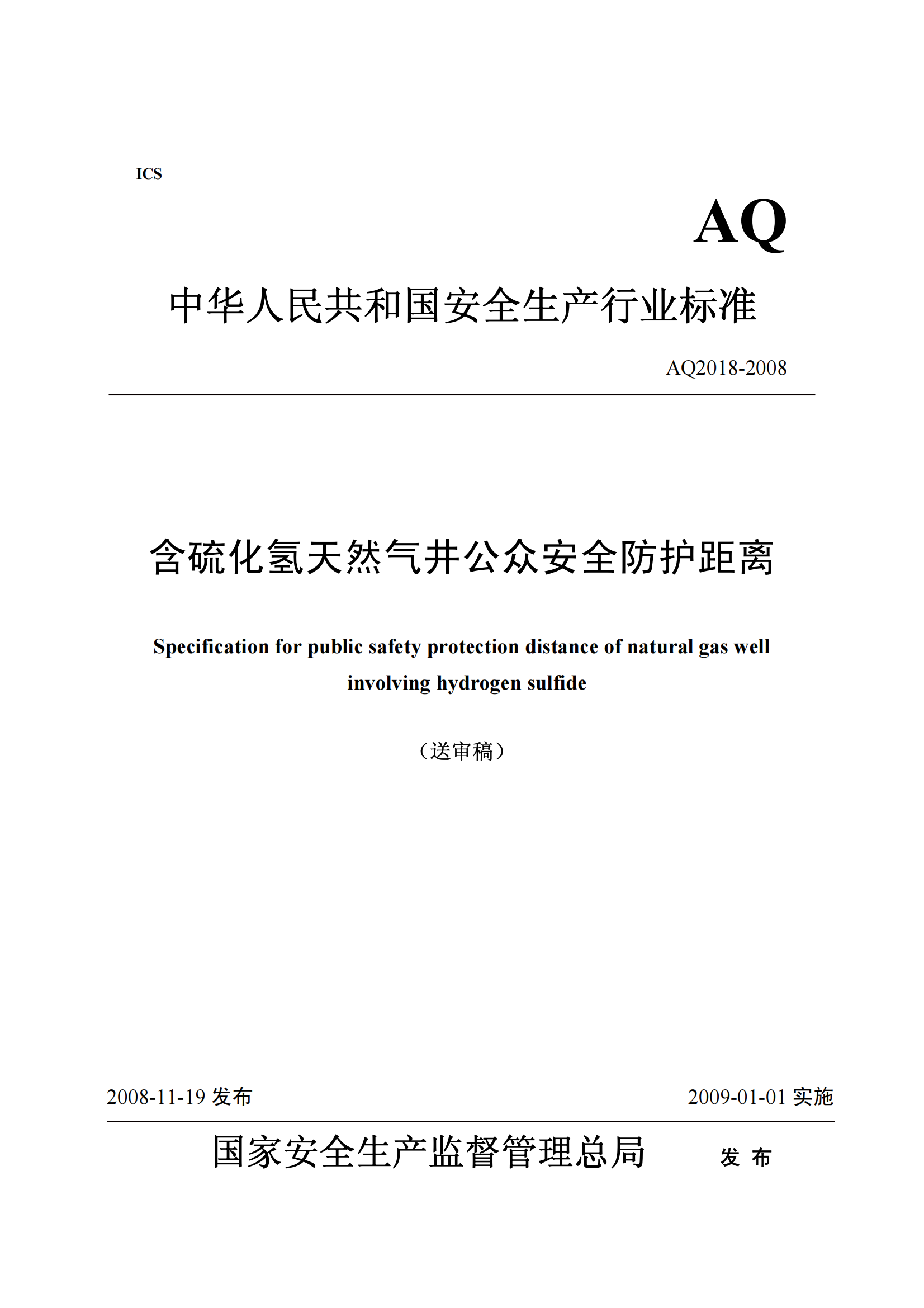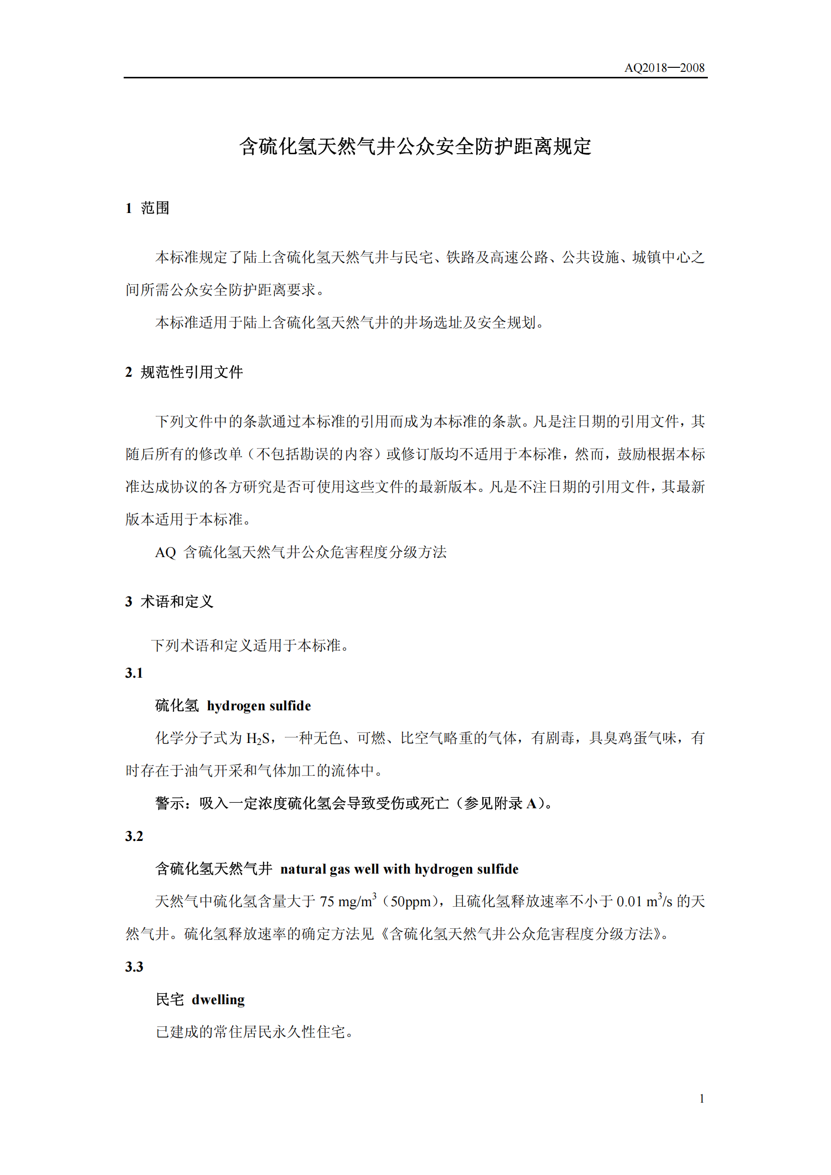 《含硫化氢天然气井公众安全防护距离》(AQ2018-2008)