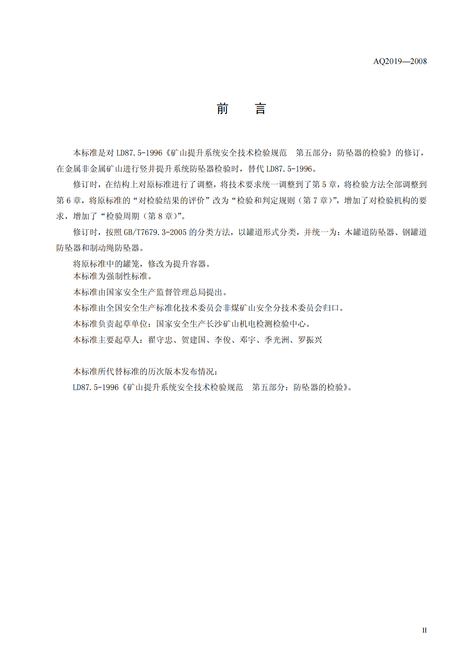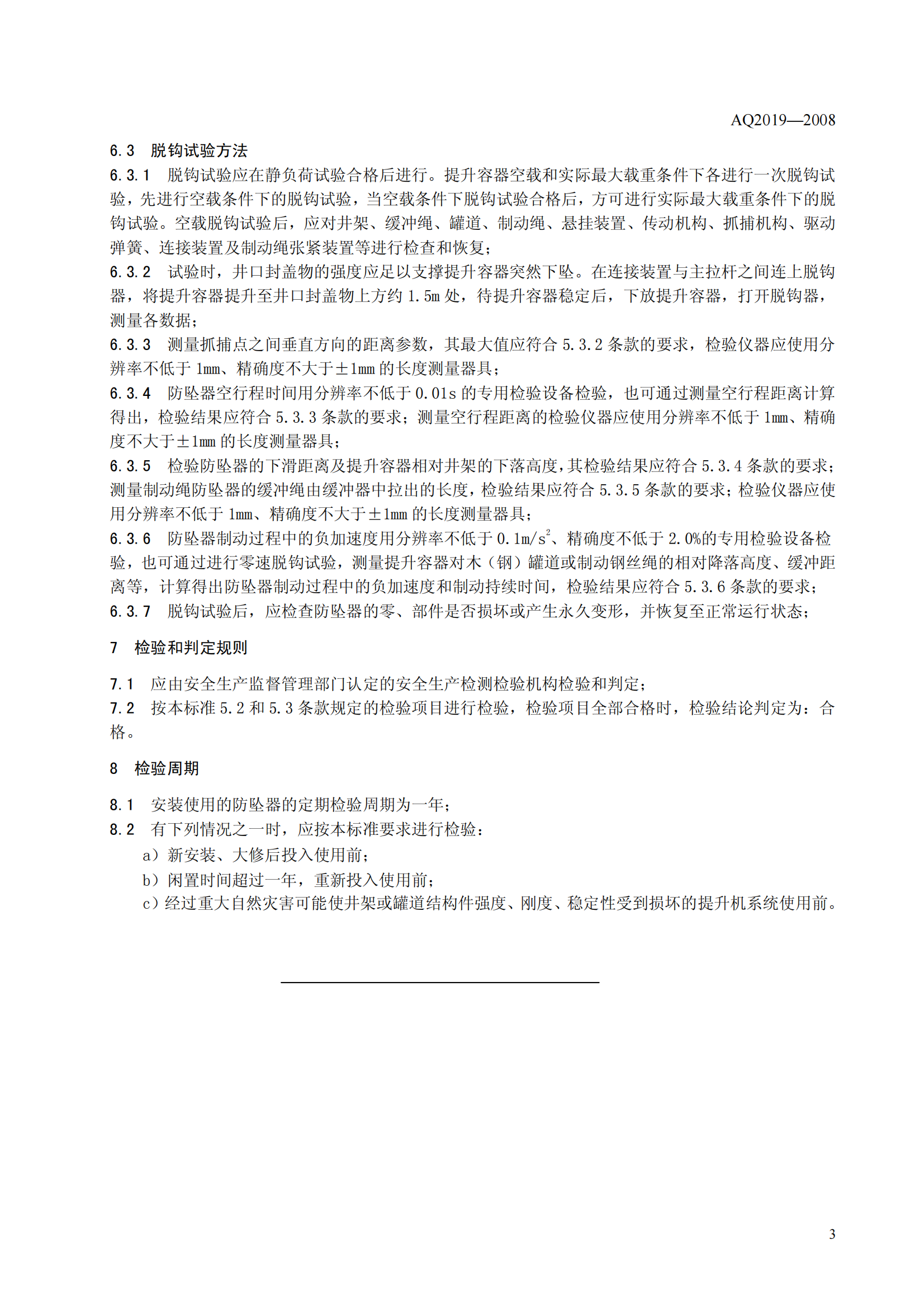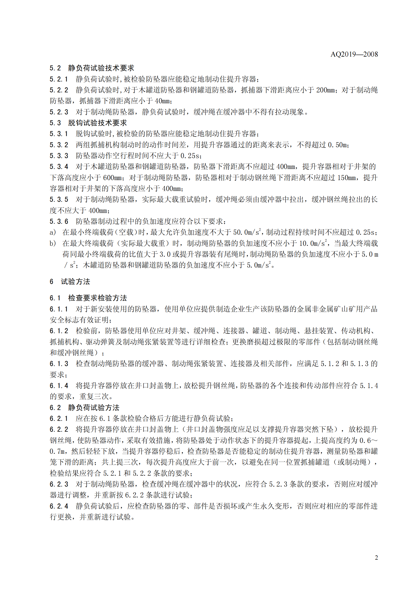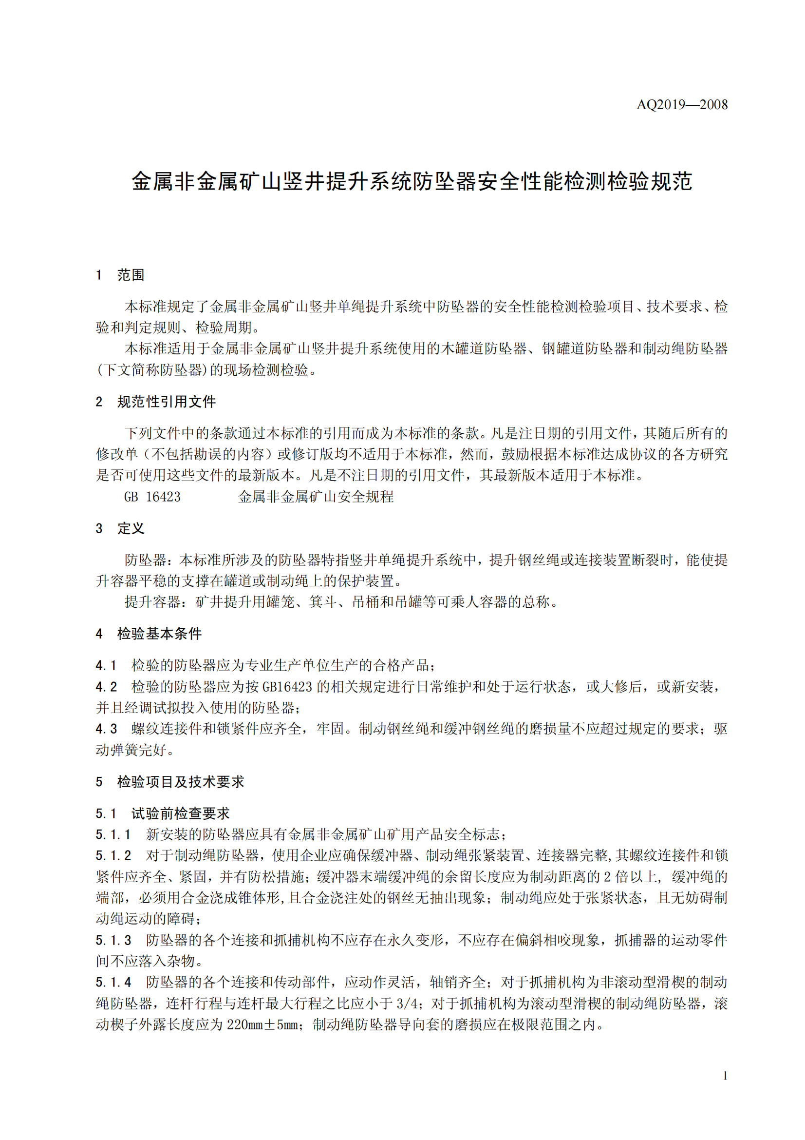 《金属非金属矿山竖井提升系统防坠器安全性能检测检验规范》(AQ2019-2008)