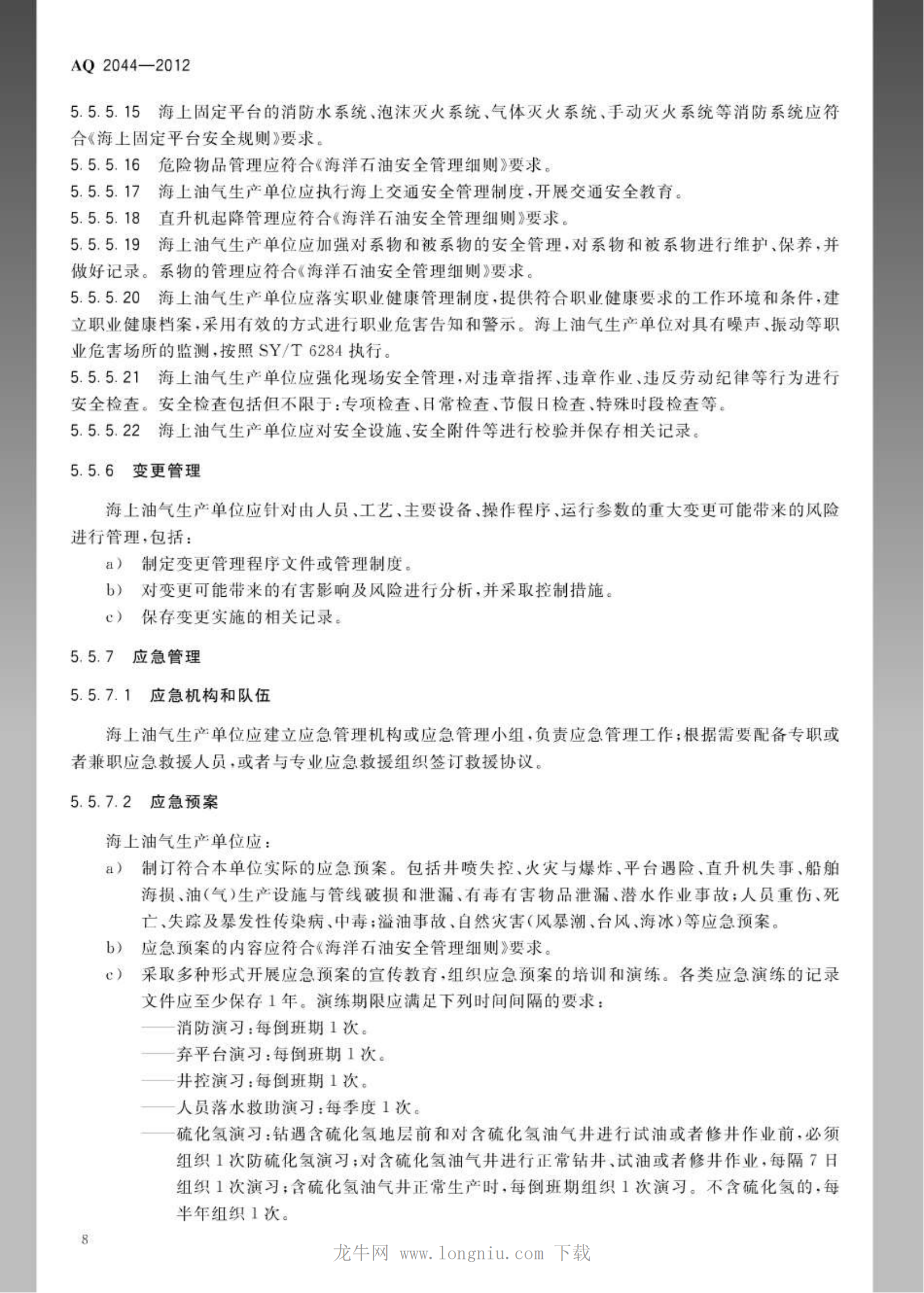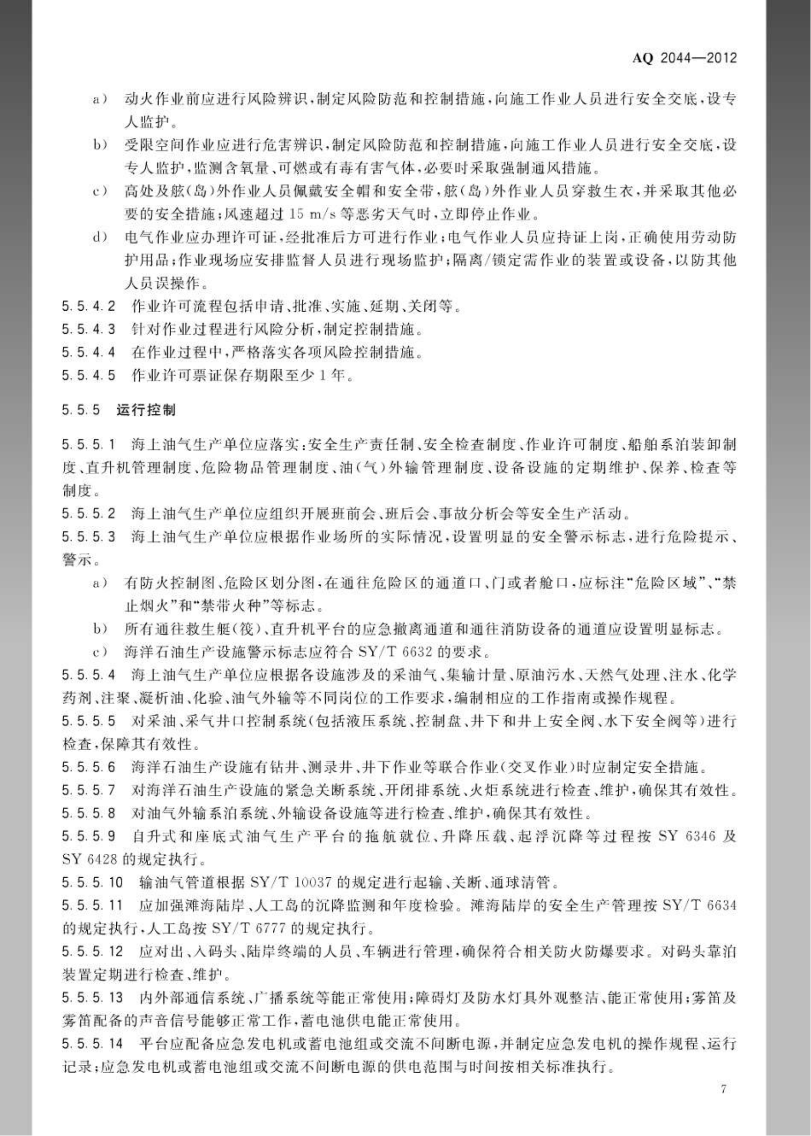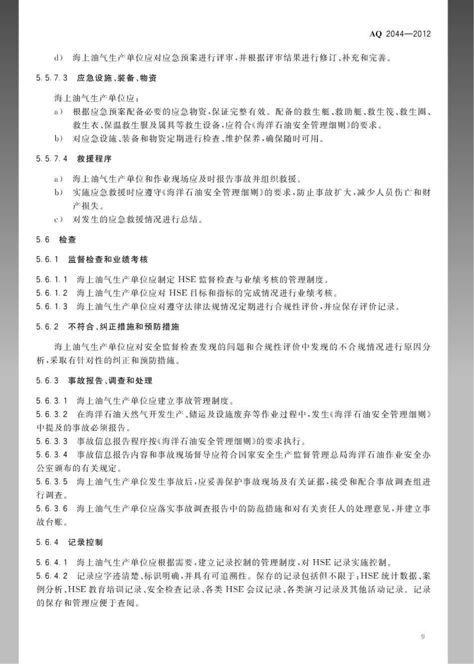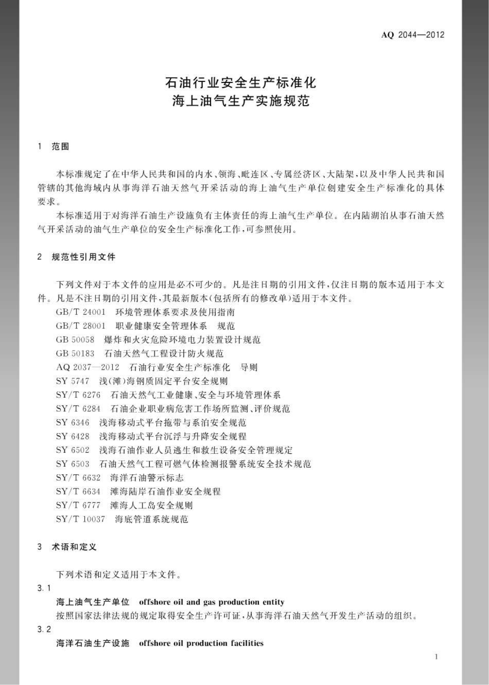 《石油行业安全生产标准化海上油气生产实施规范》(AQ2044-2012)