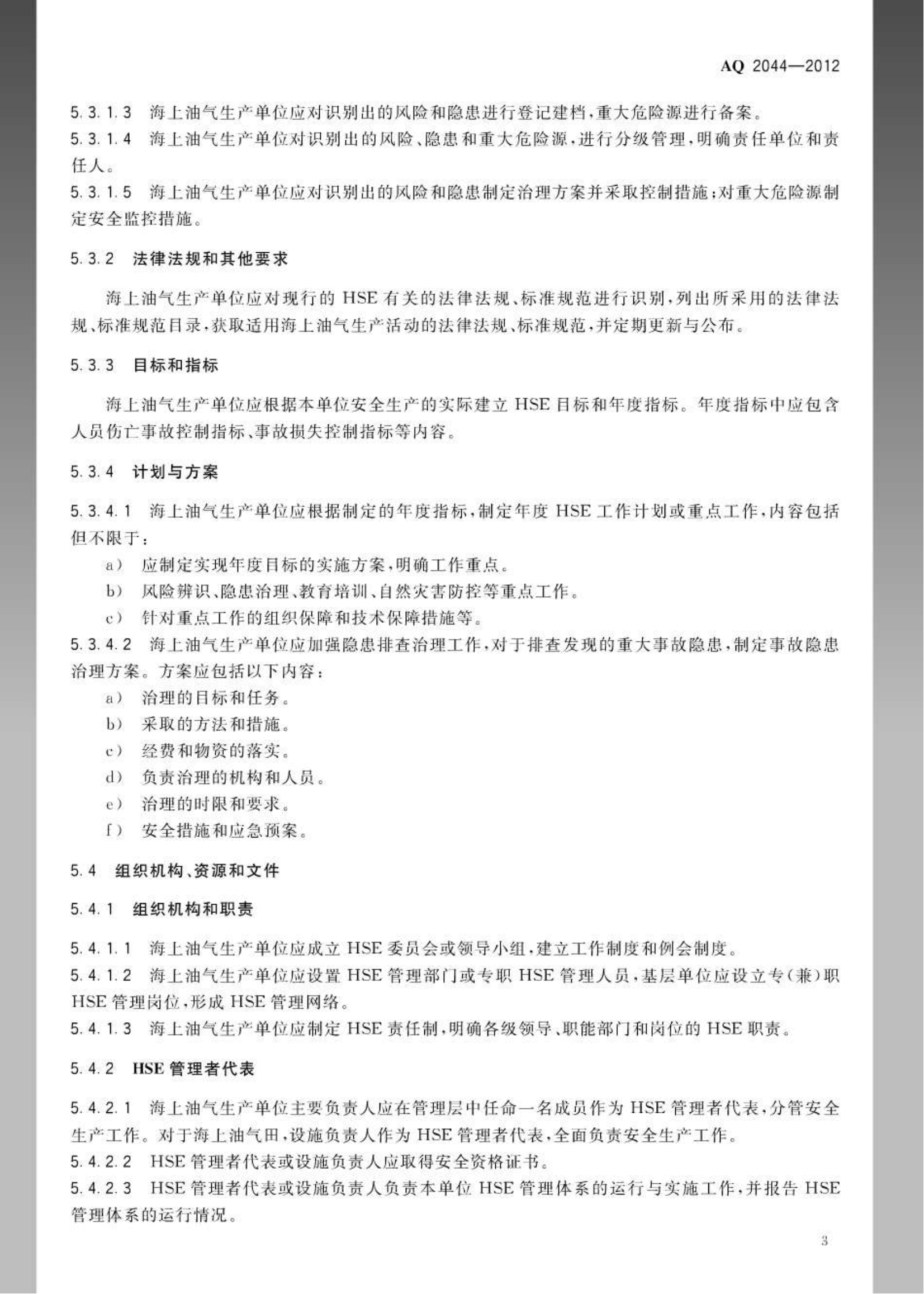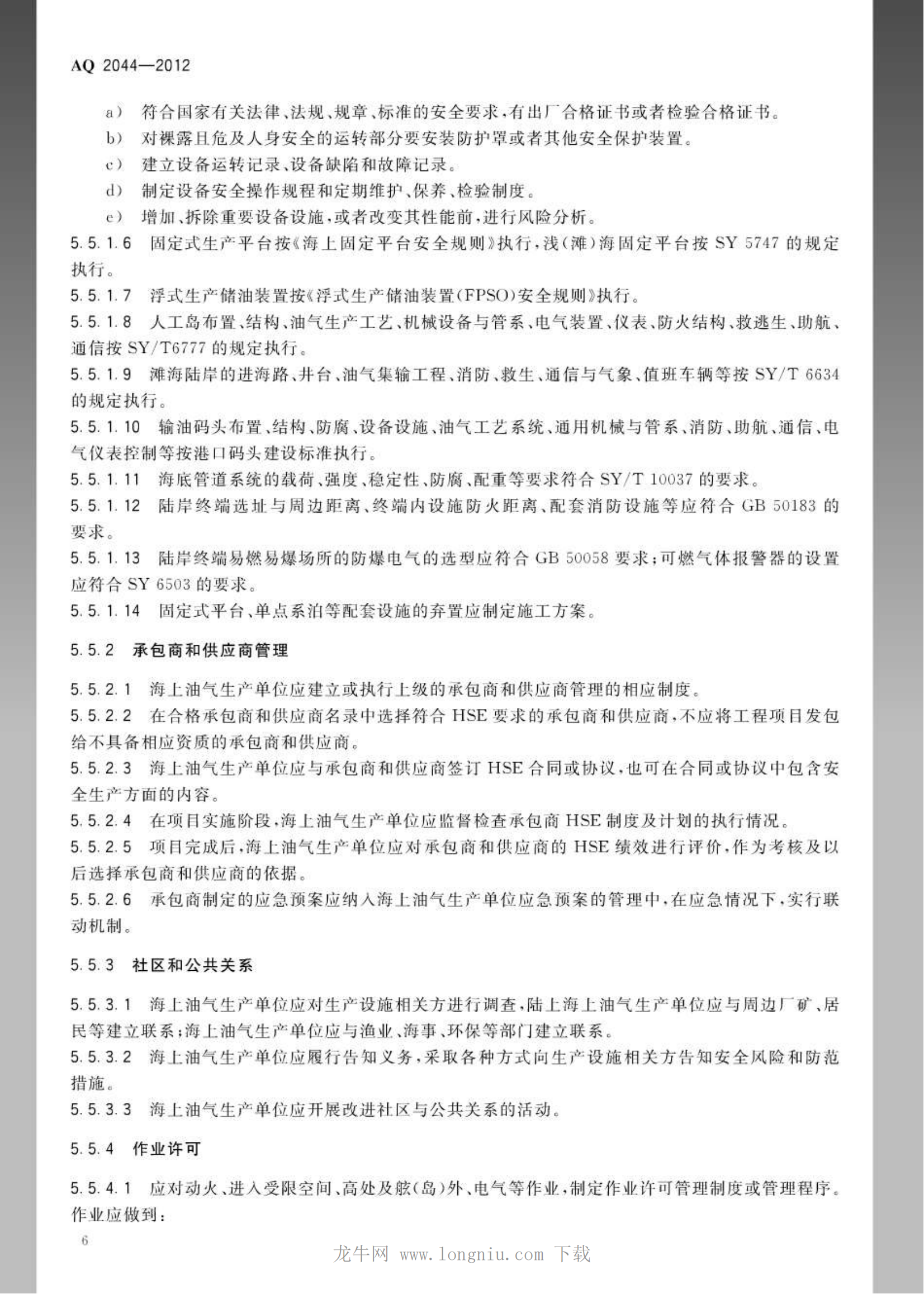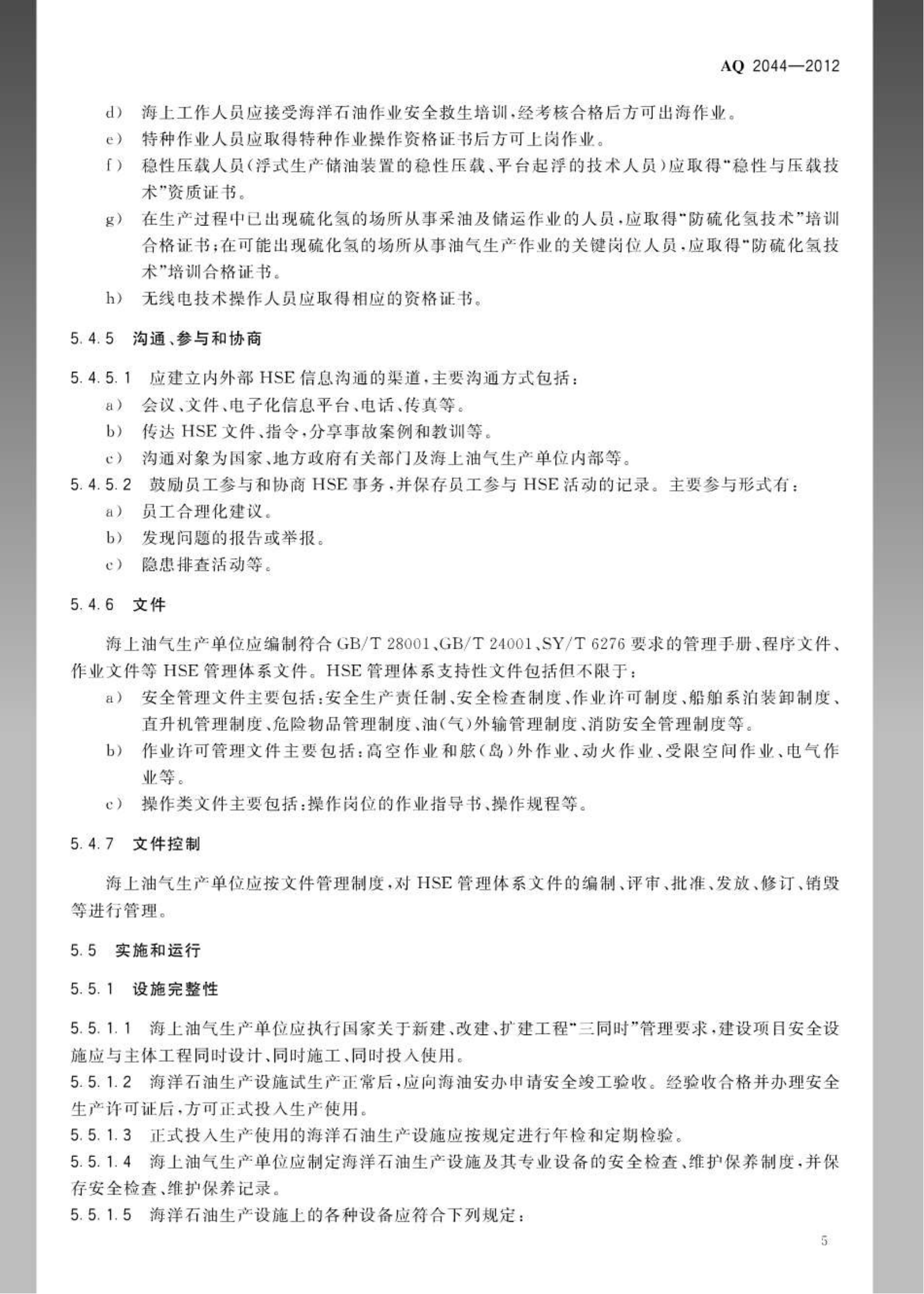 《石油行业安全生产标准化海上油气生产实施规范》(AQ2044-2012)