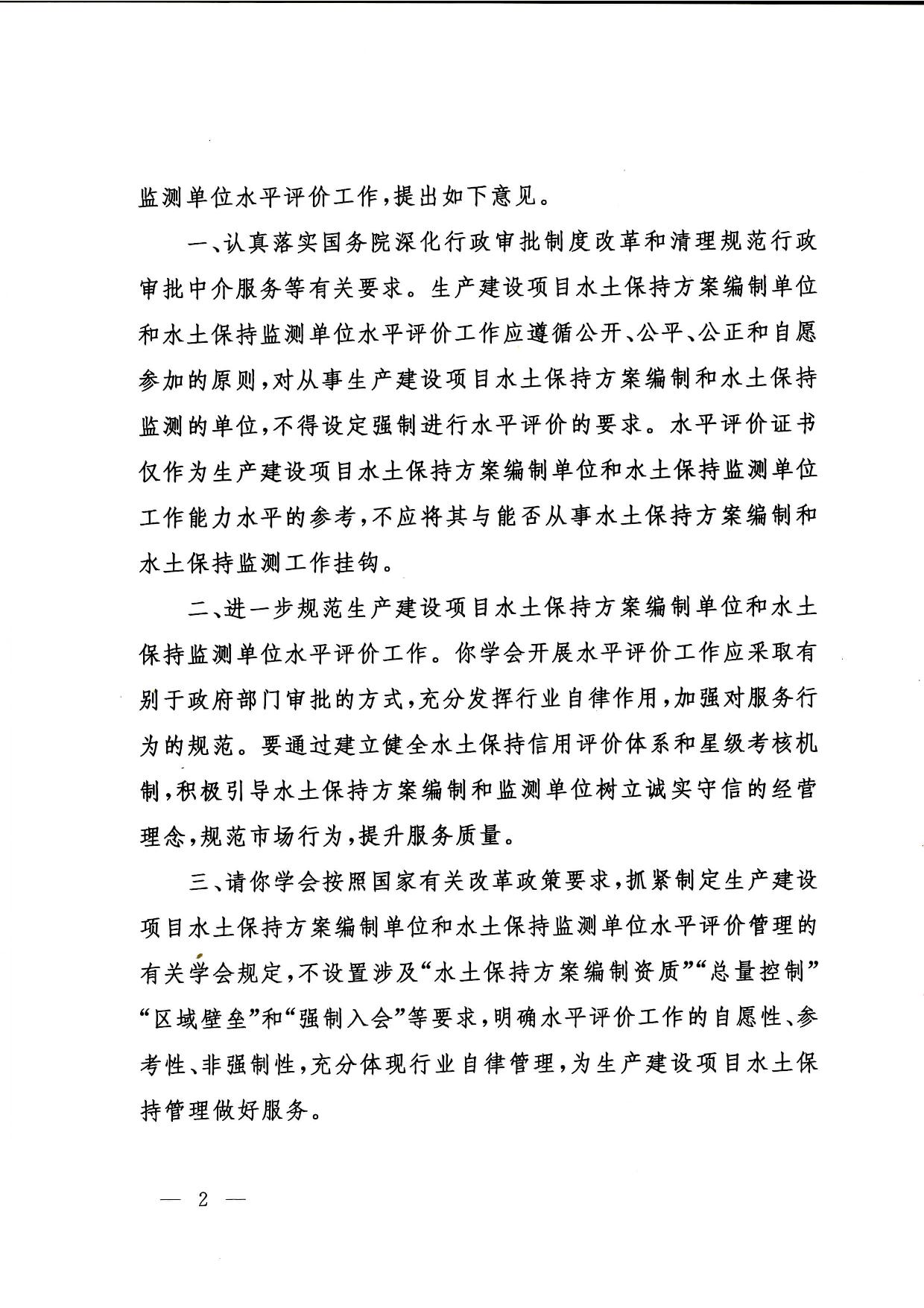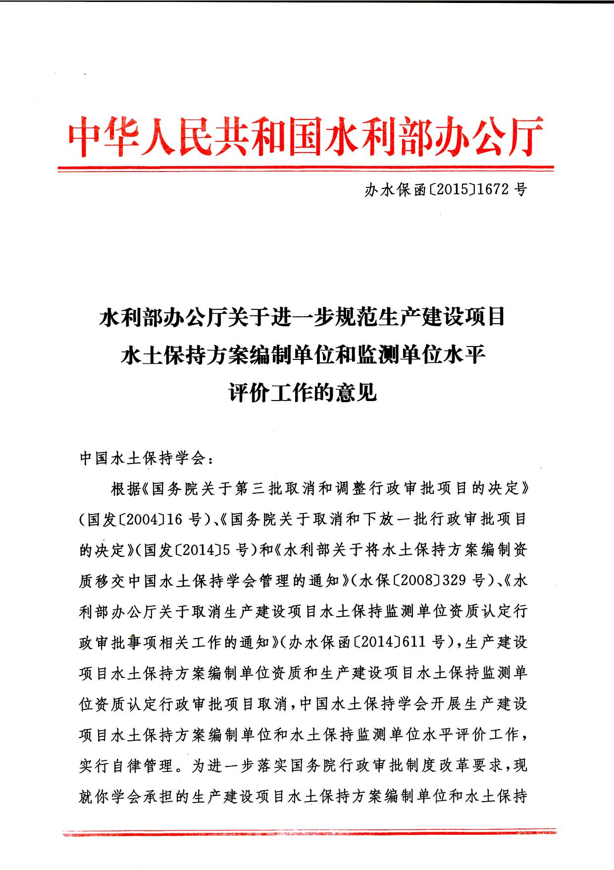 《水利部办公厅关于进一步规范生产建设项目水土保持方案编制单位和监测单位水平评价工作的意见保函》(【办水保函【2015】1672号)