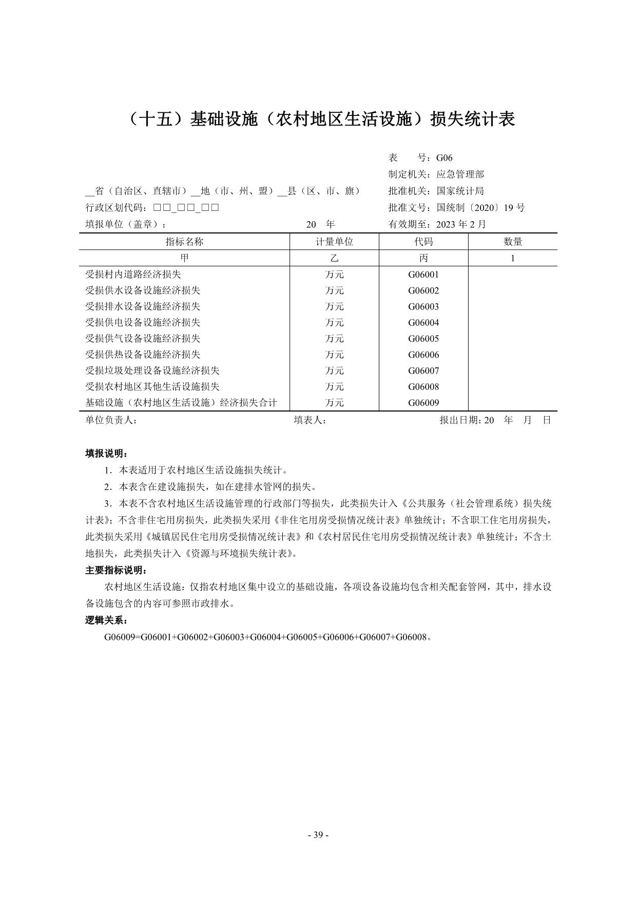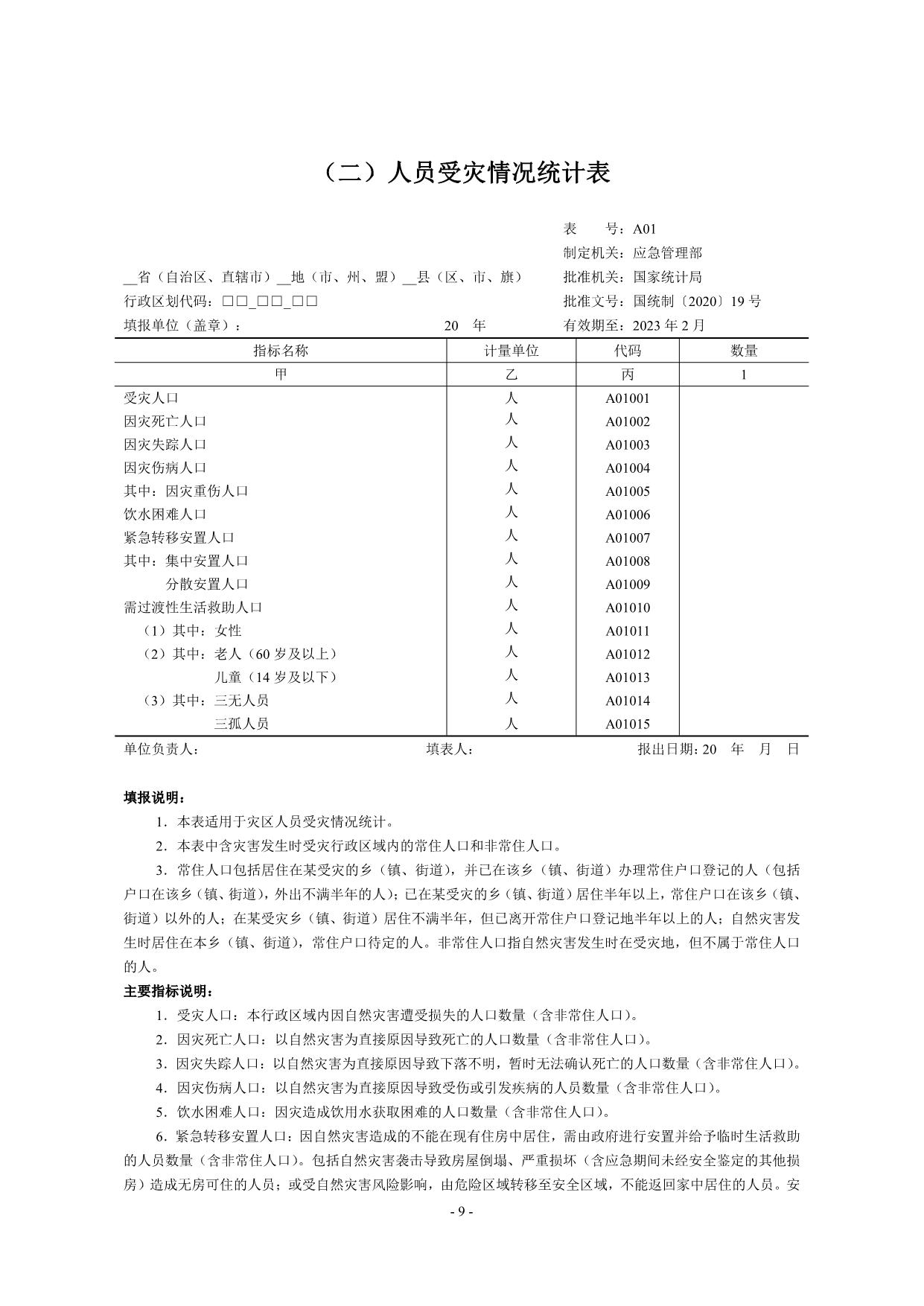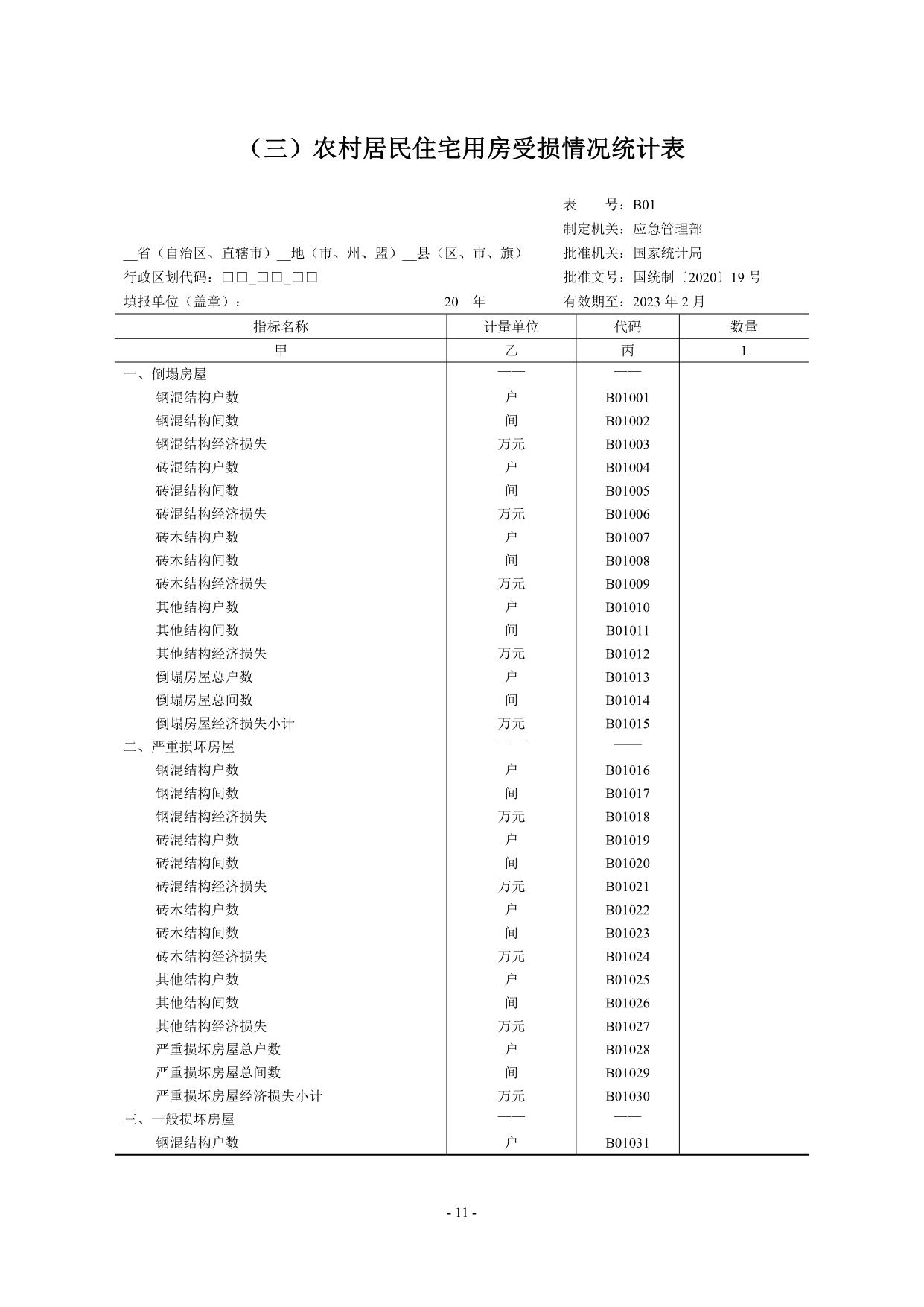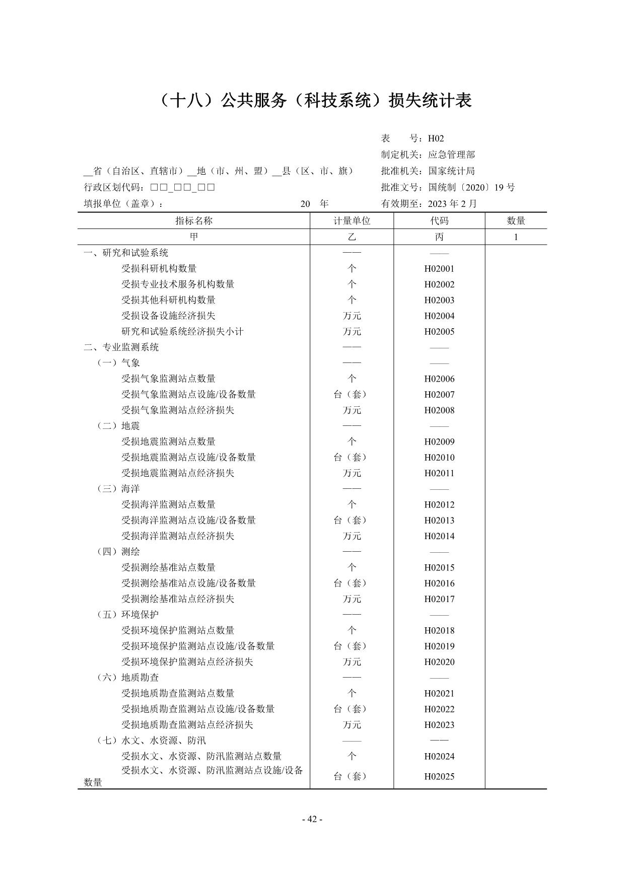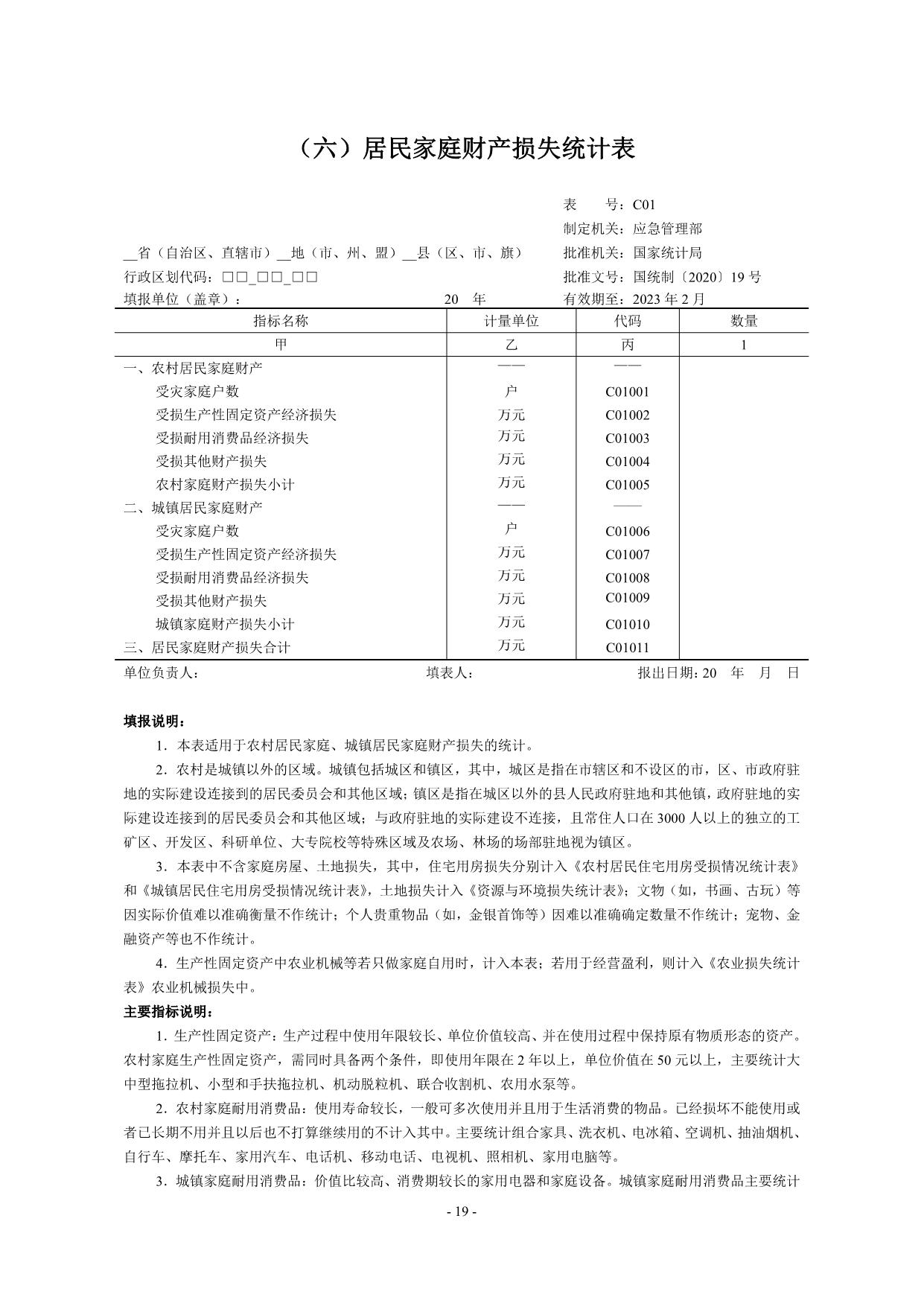 《特别重大自然灾害损失统计调查制度》(应急[2020]19号附件2)