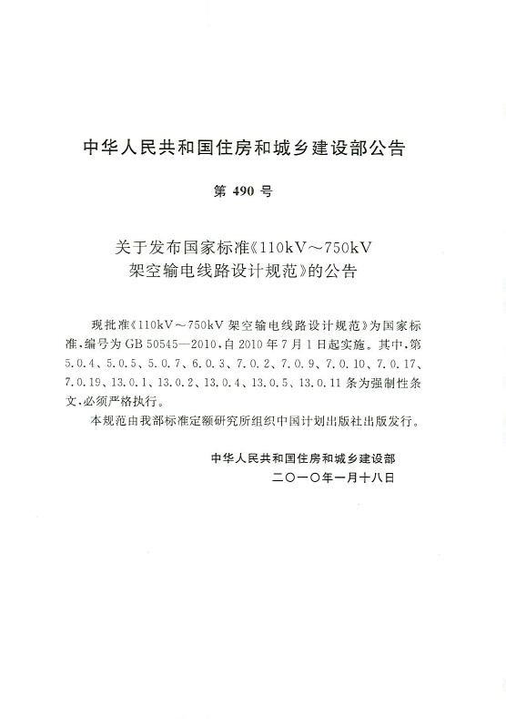 《110kV~750kV架空输电线路设计规范》(GB50545-2010)