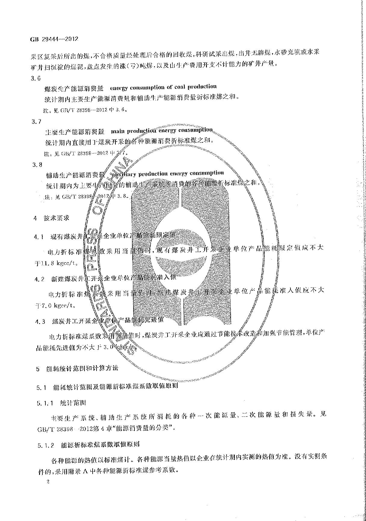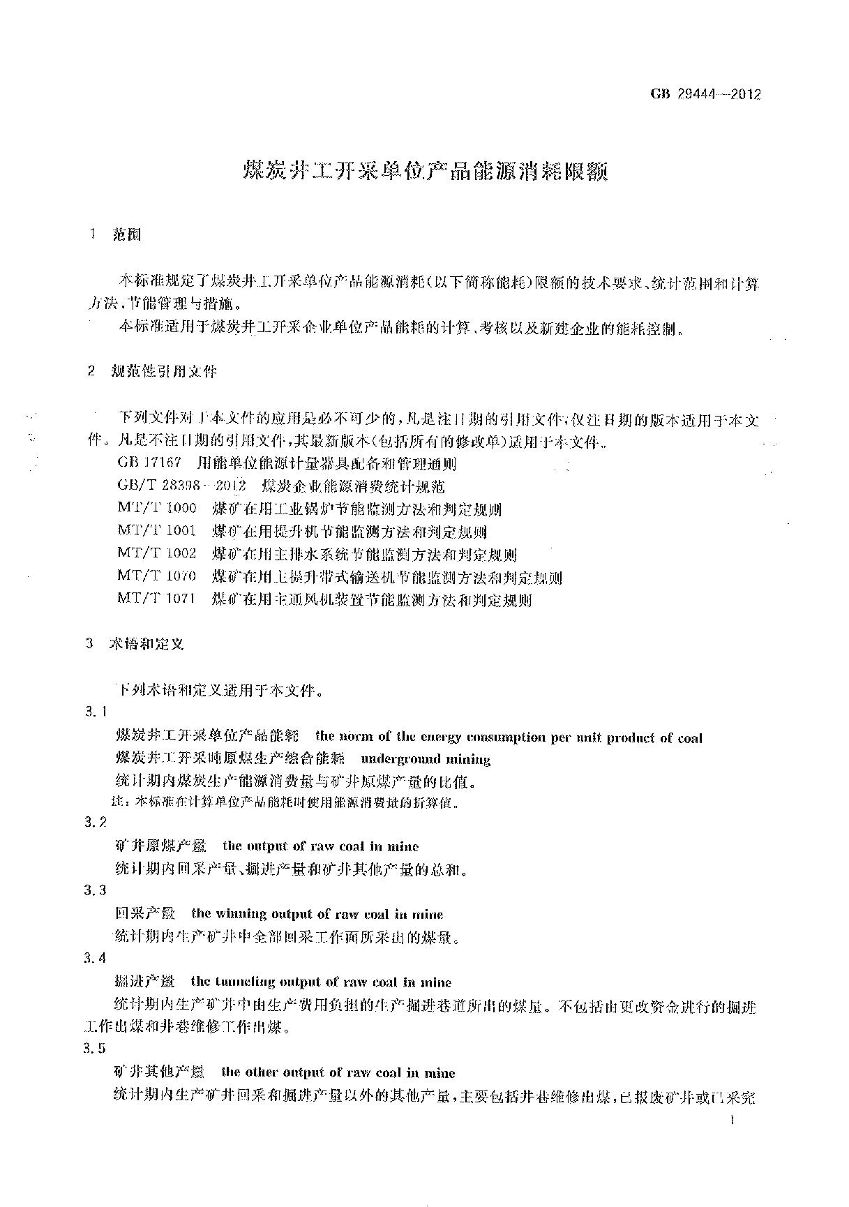 《煤炭井工开采单位产品能源消耗限额》(GB29444-2012)
