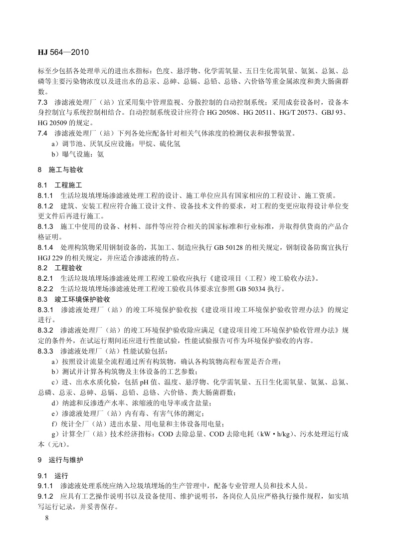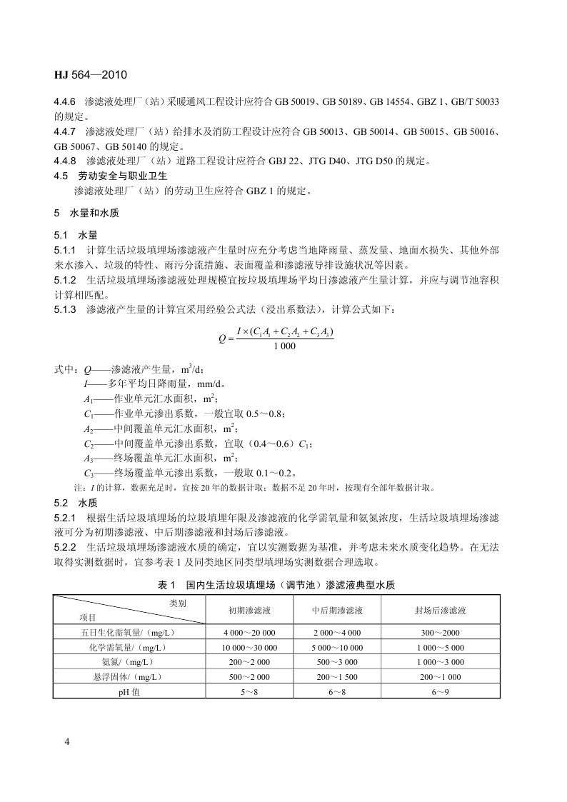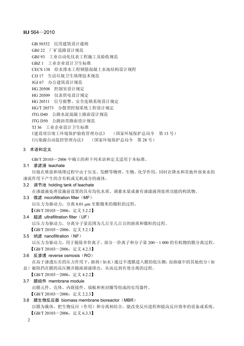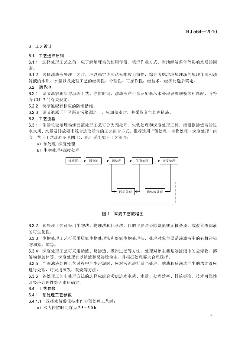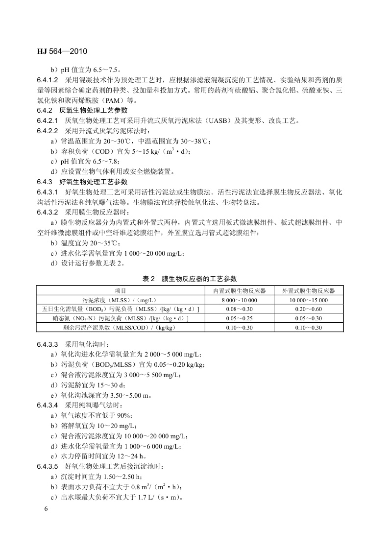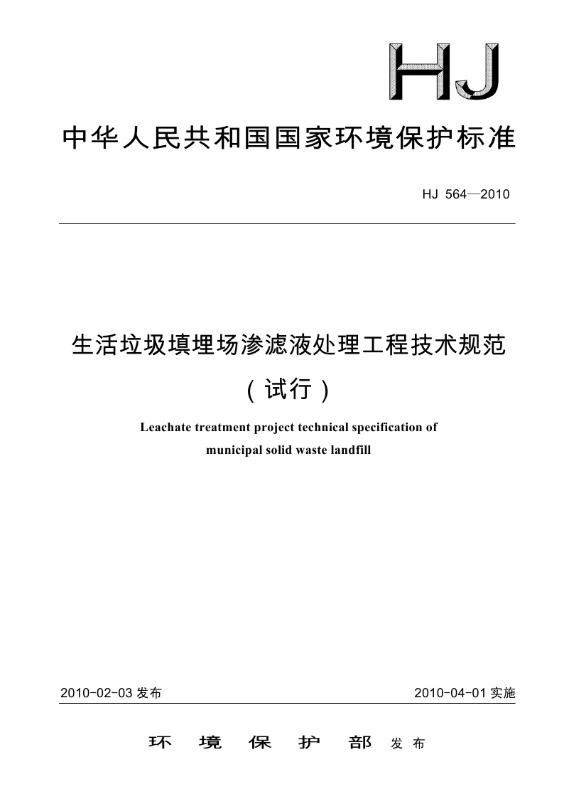 《生活垃圾填埋场渗滤液处理工程技术规范(试行)》(HJ564-2010)