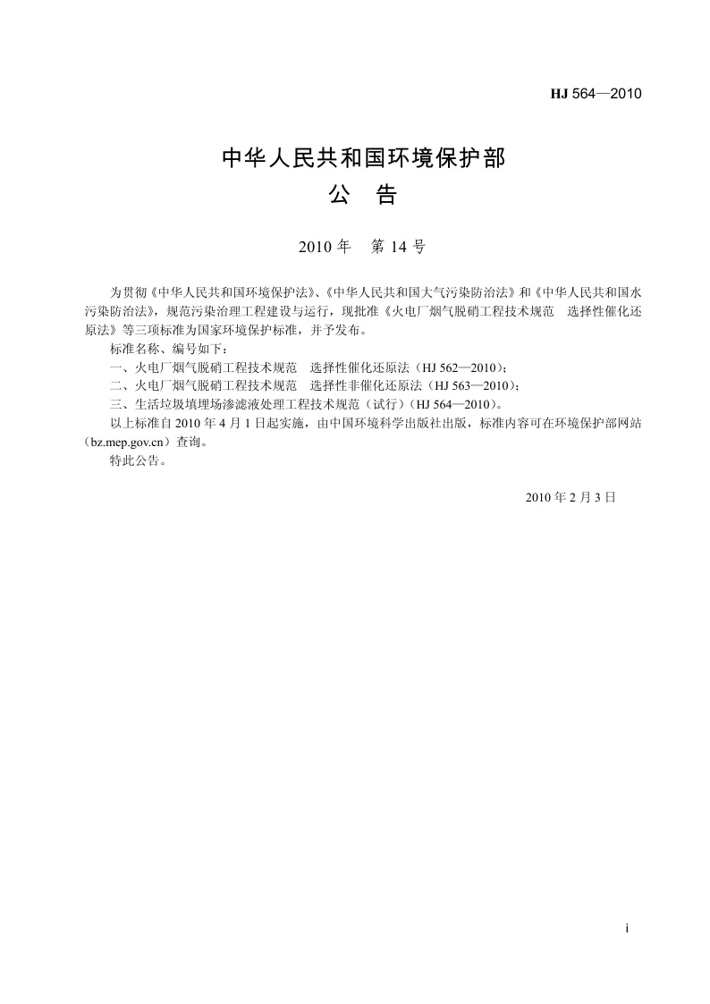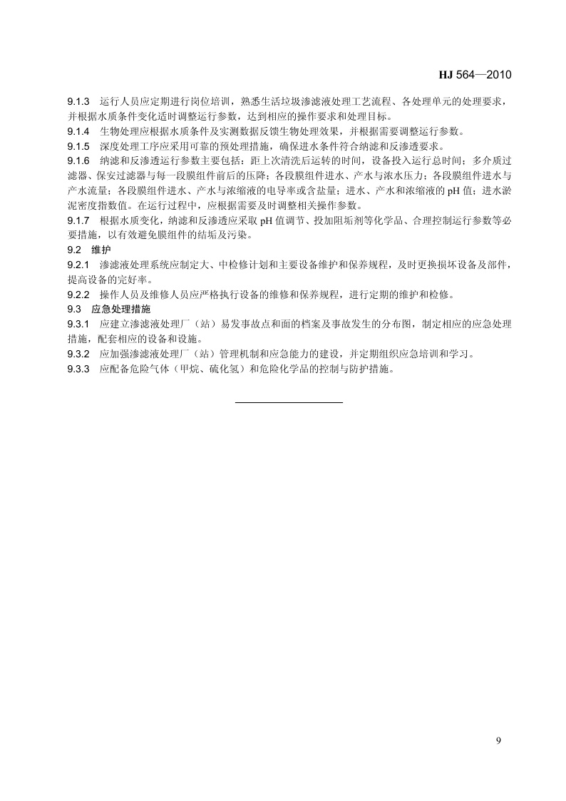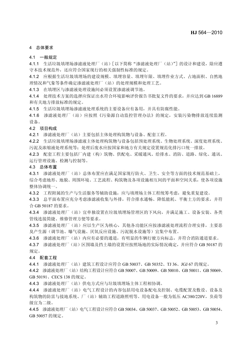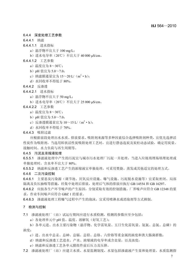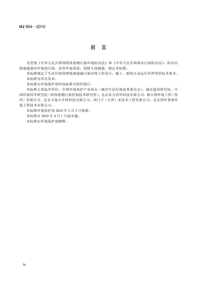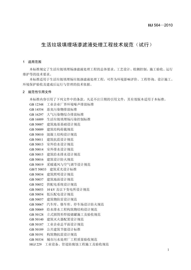 《生活垃圾填埋场渗滤液处理工程技术规范(试行)》(HJ564-2010)
