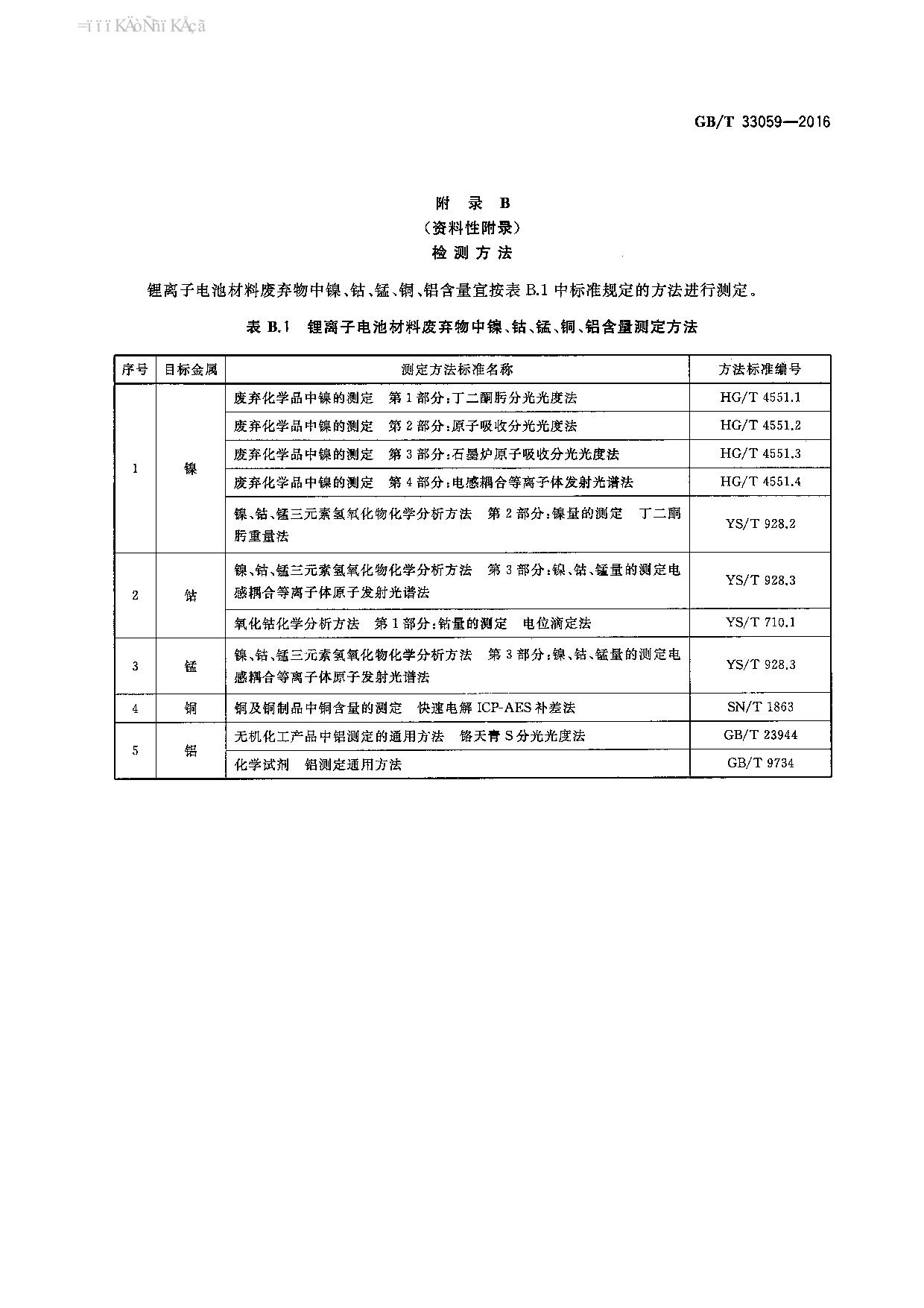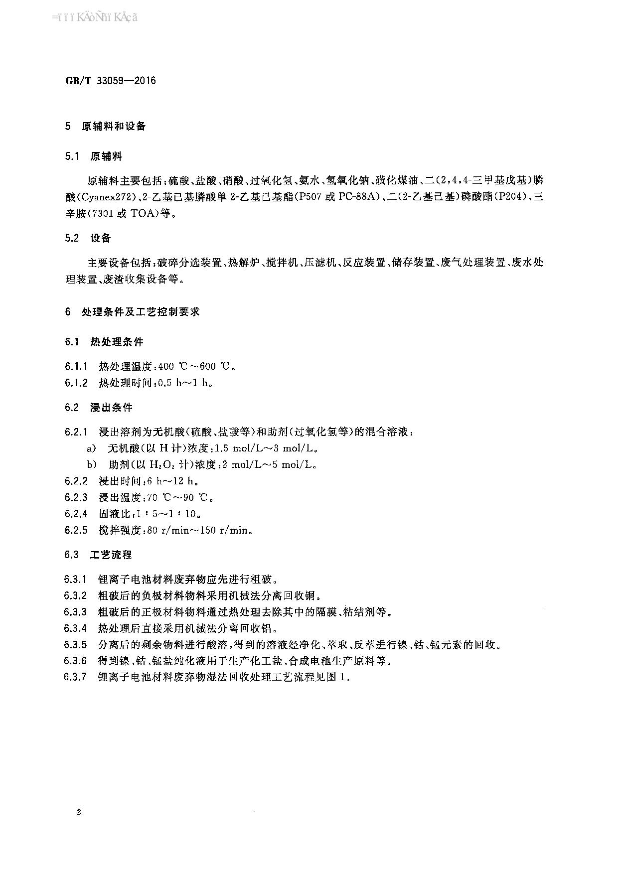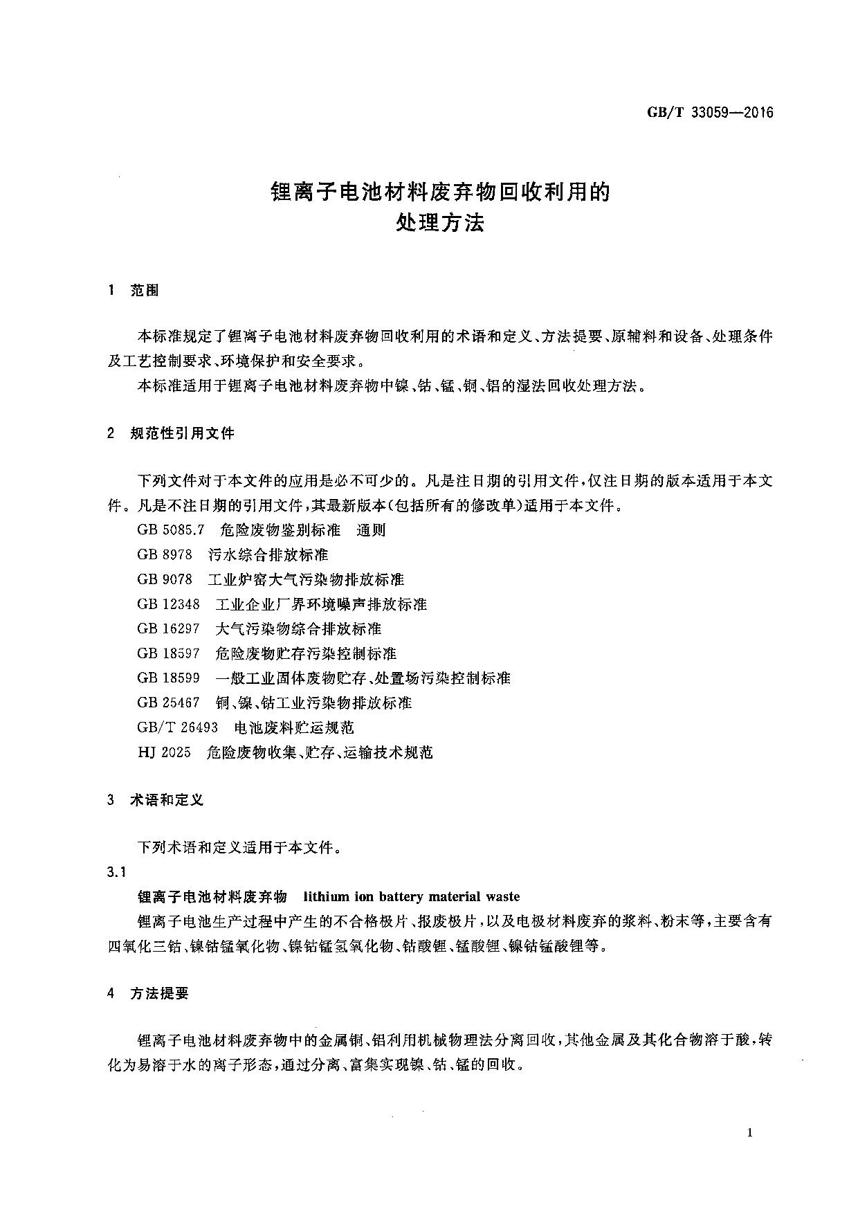 《锂离子电池材料废弃物回收利用的处理方法》(GBT 33059-2016 )