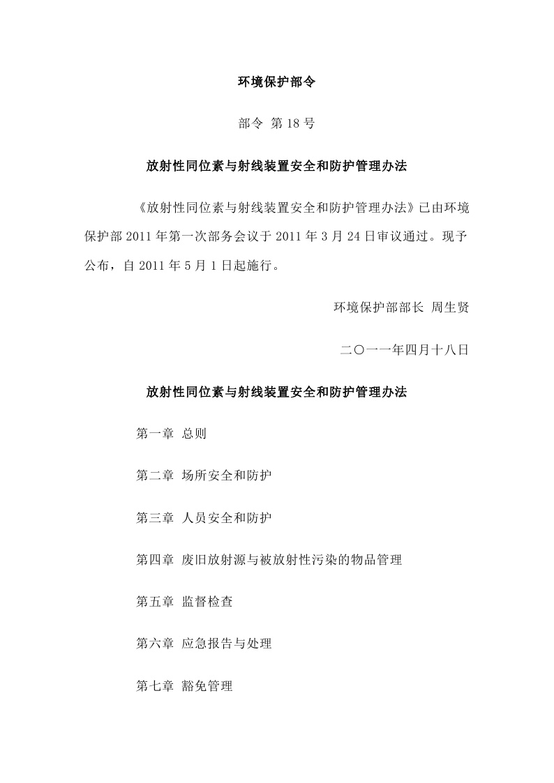 环保部 《放射性同位素与射线装置安全和防护管理办法》(2011,环保部令第18号)
