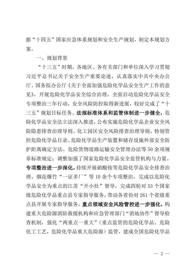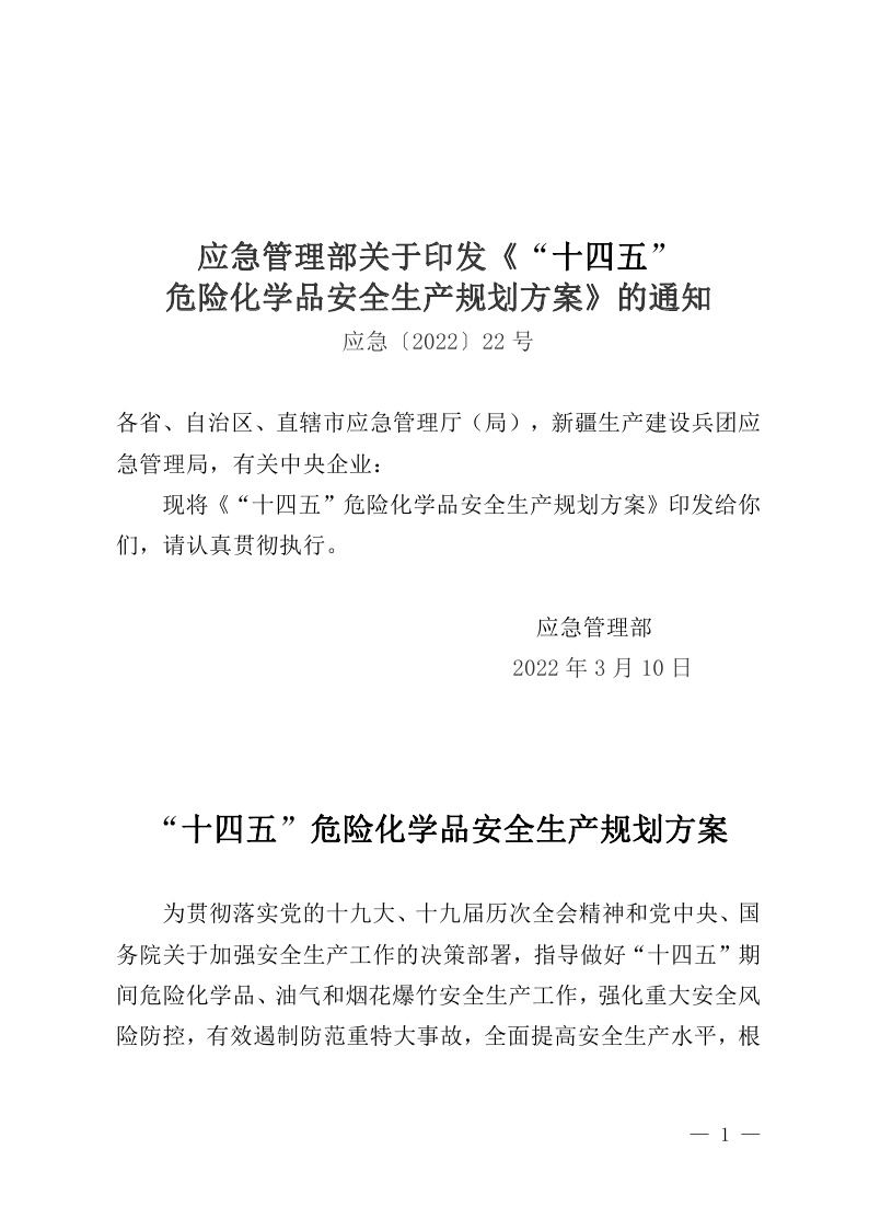 应急管理部关于印发《“十四五”危险化学品安全生产规划方案》的通知应急〔2022〕22号