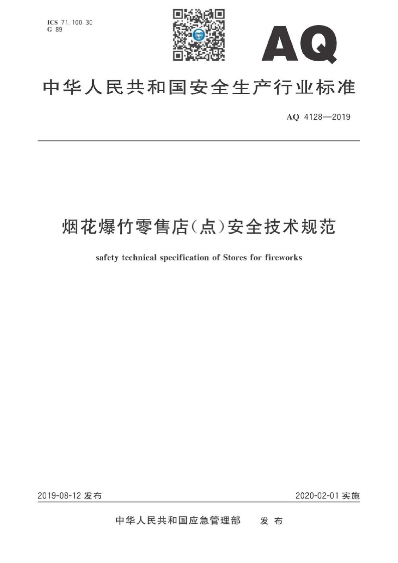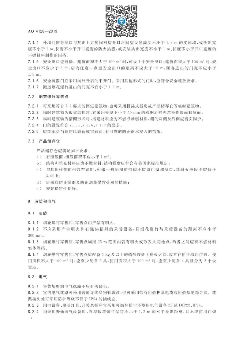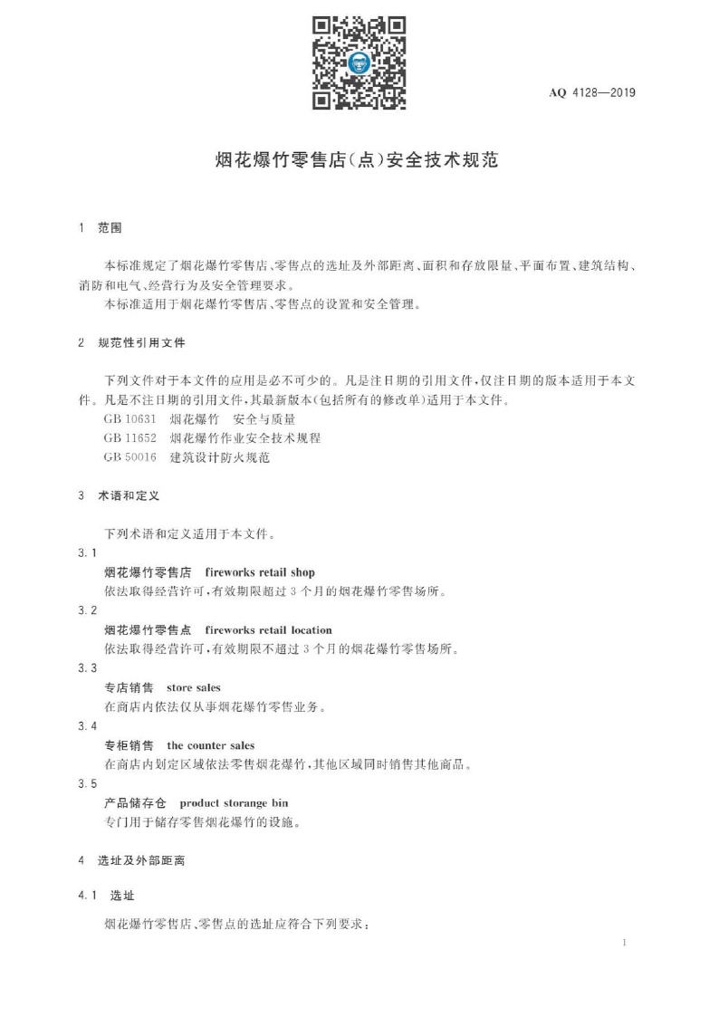《烟花爆竹零售店(点)安全技术规范》(AQ 4128-2019 )