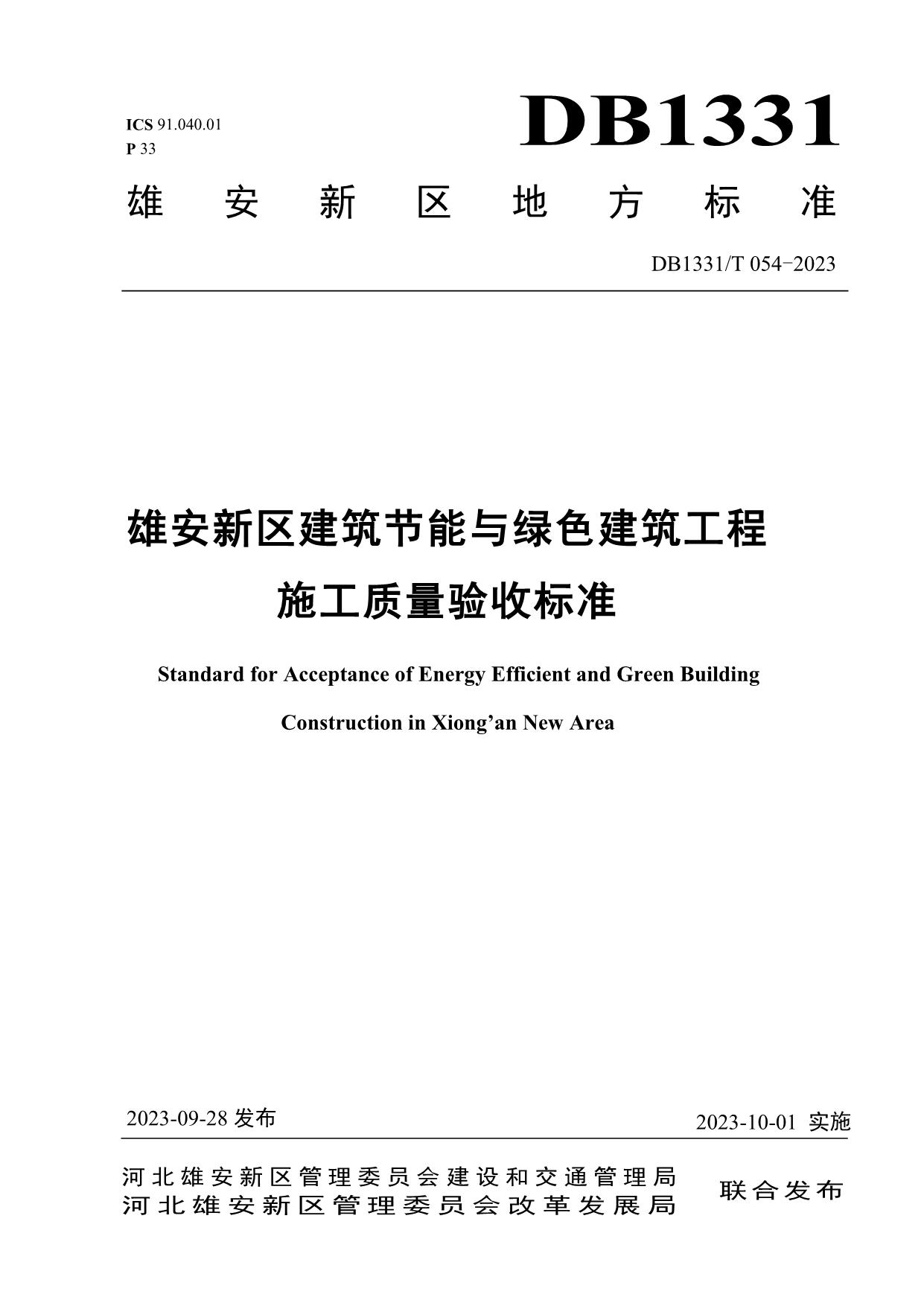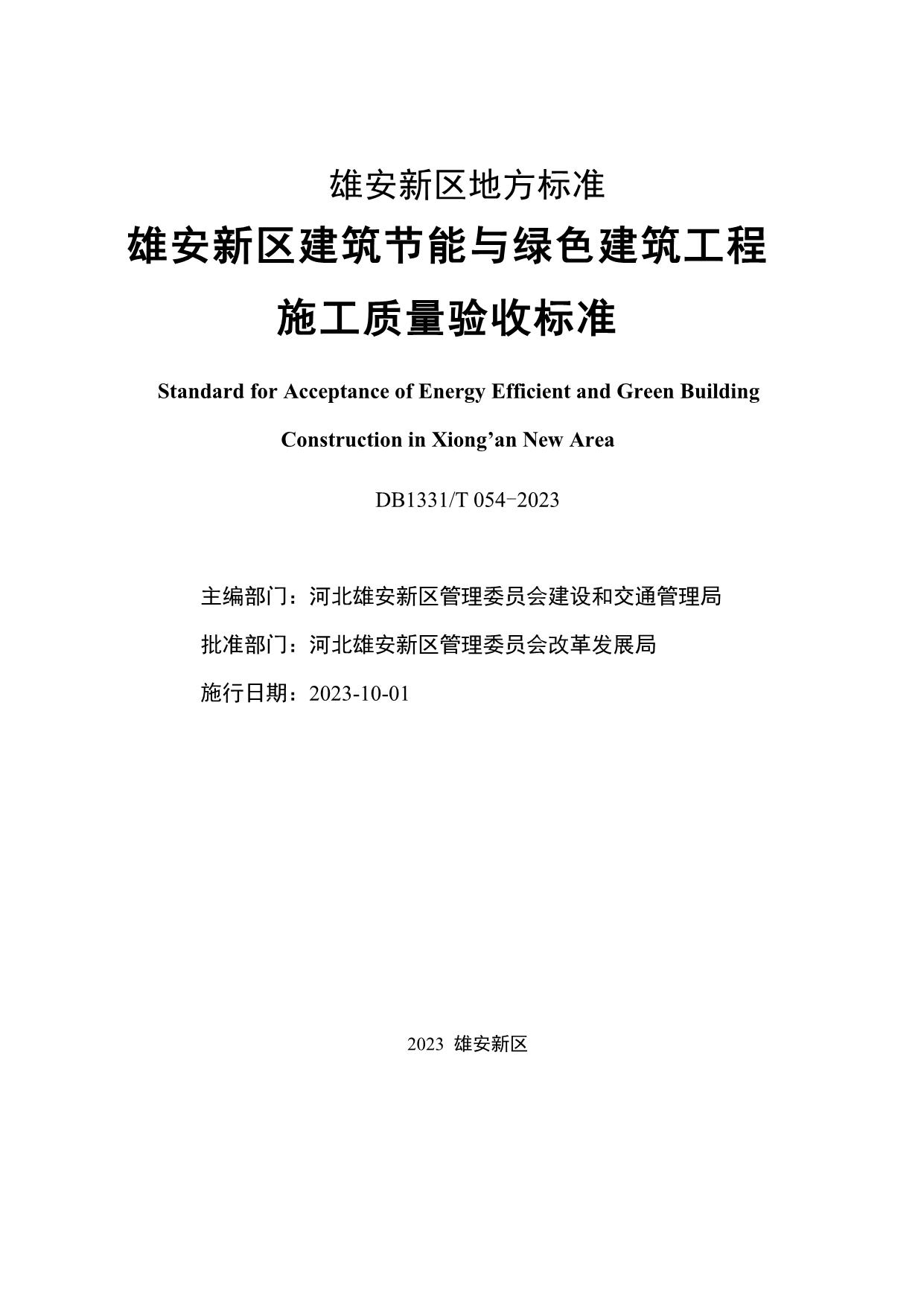 《雄安新区建筑节能与绿色建筑工程施工质量验收标准》(DB1331/T 054-2023)
