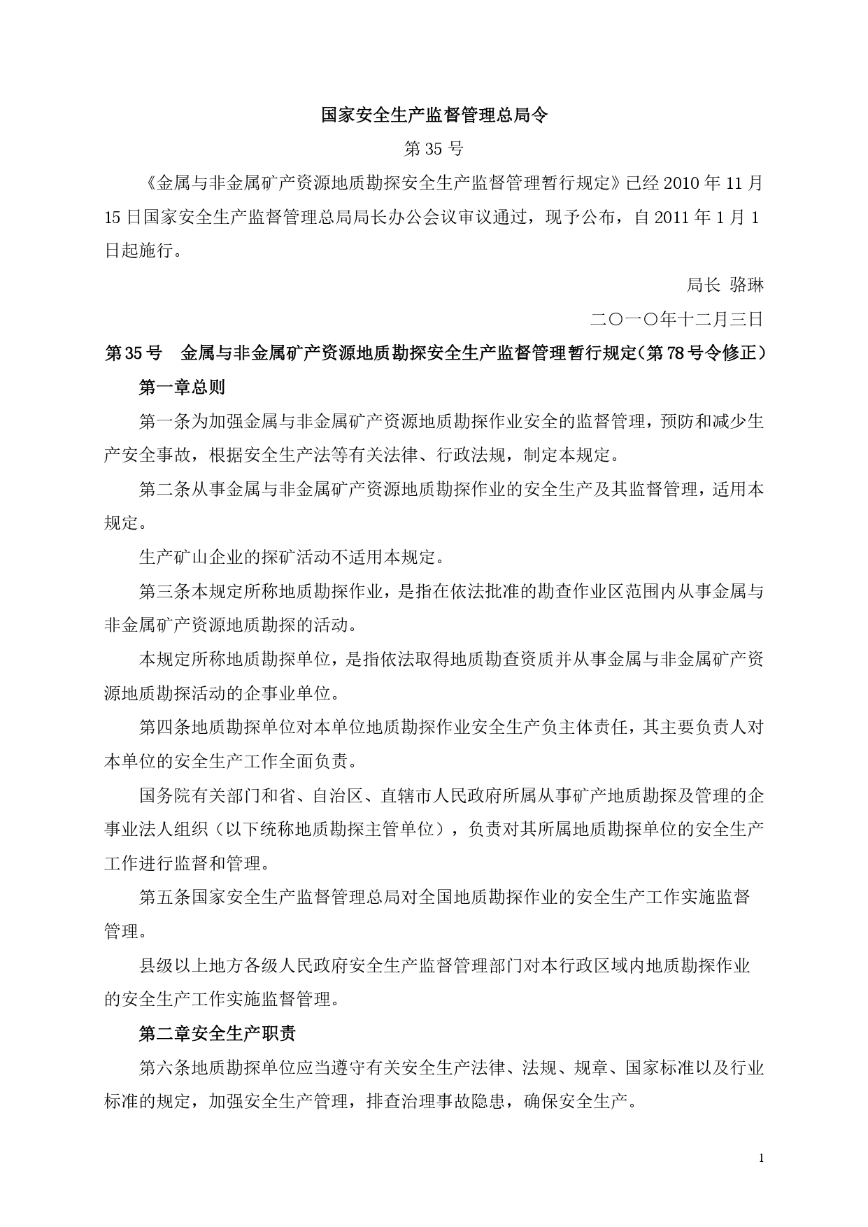 金属与非金属矿产资源地质勘探安全生产监督管理暂行规定(第78号令修正)